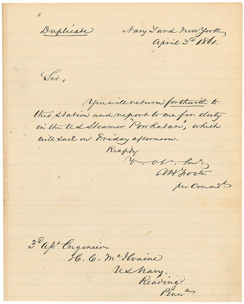 American naval admiral (1806-1863) who commanded the Mississippi River Squadron during the Civil War. After his promotion to read admiral, Foote was on his way to take command of the South Atlantic Blockading Squadron when he died en route on June 26, 1863. LS signed “A. H. Foote,” one page, lightly-lined, 7.75 x 9.5, April 3, 1861. Letter to a naval engineer. In full: “You will return forthwith to this station and report to me for duty in the US Steamer ‘Powhasan,’ which will sail on Friday afternoon.” Scattered toning, some stray ink marks, and a thin mounting strip along one reverse edge, otherwise fine condition.