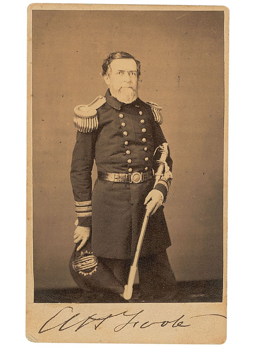 American naval admiral (1806–1863) who commanded the Mississippi River Squadron during the Civil War. After his promotion to rear admiral, Foote was on his way to take command of the South Atlantic Blockading Squadron when he died en route on June 26, 1863. Original 2.5 x 4 carte-de-visite portrait of Foote in uniform and holding a sword by J. F. Ryder of Cleveland, signed in the lower border in black ink. In fine condition.
