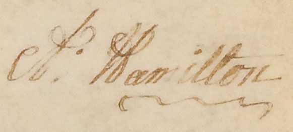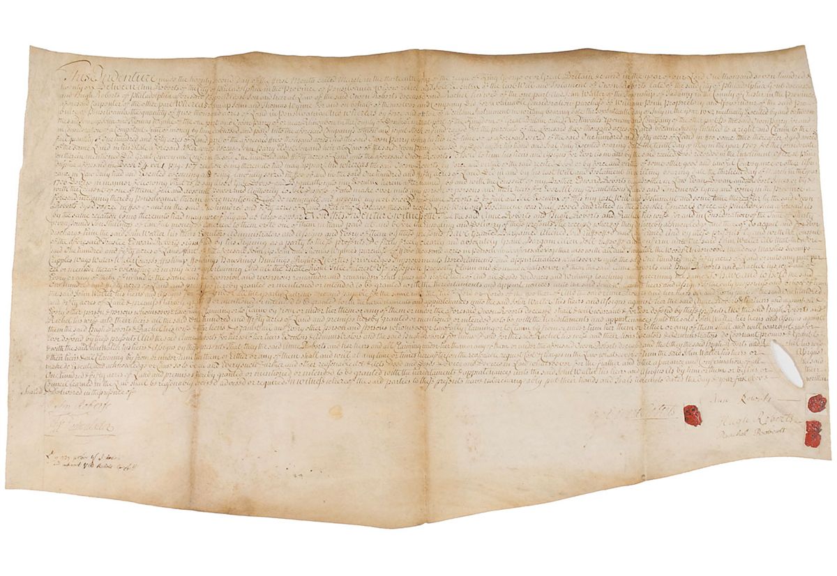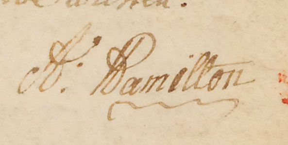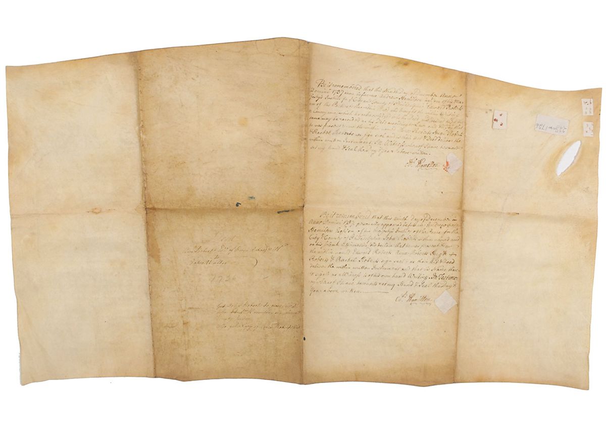 American lawyer (1676–1741) and uncle of statesman Alexander Hamilton. Andrew Hamilton is best known for his defense of publisher John Peter Zenger, establishing a legal precedent for truth as a defense to an accusation of libel. Hamilton’s prowess before the bench is said to have given rise to the phrase ‘Philadelphia lawyer.’ Manuscript DS, signed twice on the reverse, “Andrew Hamilton,” one page on vellum, 27 x 14, December 9, 1737. An indenture for the sale of 5000 acres in Pennsylvania between Ann Roberts and John and Thomas Wyne. Hamilton has signed twice on the reverse as a justice of the peace for the city and county of Philadelphia. In good condition, with heavy intersecting folds (with small holes), soiling and toning, and large oblong hole at lower right hole clearly original to the sheet, as the text is written around it). Hamilton’s signatures are dark and clear.