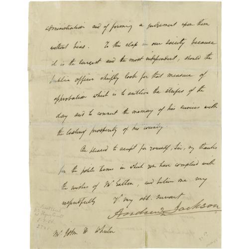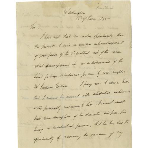 <B>Andrew Jackson (1767-1845) President, Letter Signed,</B></I> "Andrew Jackson" as President, two pages,7.5" x 9.75", Washington, June 15, 1835 to John H. Wheeler. Jackson acknowledges "<I>...your favor of the 6th instant and of the care which accompanied it as a testimonial of the kind feelings entertained for me by your neighbor Mr. Gordon Gartlin. I pray you to assure him that I received his present with satisfaction and pleasure...I cannot doubt from your description of his character, and from his being a substantial farmer, that he has had the opportunity of examining the measures of my administration and of forming a judgment upon them without bias. To his class in our society because it is the largest and the most independent, should the public officer chiefly look for that measure of approbation which is to outlive the strives of the day and to connect the memory of his services with the lasting prosperity of his country...</B></I>" Jackson built his political support from independent yeoman farmers and others outside of the traditional political "class" exemplified by John Quincy Adams. And, of course, embracing the "common folk" put Old Hickory in the Executive Mansion. Fold separations repaired, light toning, else near fine. A wonderful example. From the Henry E. Luhrs Collection. Accompanied by LOA from PSA/DNA.