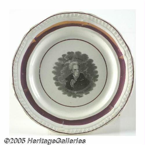 <B>Andrew Jackson 1824 Pink Luster Plate</B></I> A wonderful example which features a campaign image of Andrew Jackson in civilian dress by Enoch Wood with "General Jackson" above and "The Hero of New Orleans" below. The transfer is near mint. The plate itself is in excellent shape. Diameter 8 3/4". Lot:255