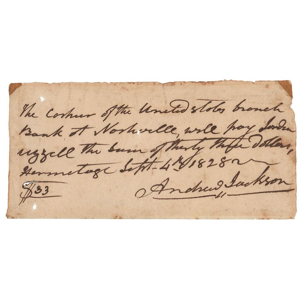ADS signed "Andrew Jackson," one page, 6.5 x 3, September 4, 1828. Handwritten pay order, in full: "The Cashier of the United States branch Bank at Nashville will pay Jordan Ezzell the sum of thirty three dollars, Hermitage, Sept. 4th 1828." In very good to fine condition, with a few small holes, and old tape to the upper corner tips.