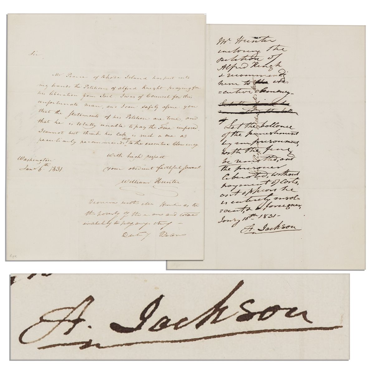 Andrew Jackson autograph endorsement signed, dated 16 January 1831. Document grants executive clemency to prisoner Alfred Knight and reads in full: ''Mr. Hunter enclosing the petition of Alfred Knigh [sic] & recommending him to executive clemency. Let the ballance of the punishment by imprisonment, with the fine be remitted, and the prisoner liberated, without payment of costs as it appears he is entirely insolvent & a foreigner.'' Signed ''A. Jackson'' to the fourth integral page of an autograph letter signed by William Hunter, who seeks to pardon and release Knight. That letter reads in full, ''Mr. Pearce of Rhode Island has put into my hands the Petition of Alfred Knight praying for his liberation from Jail. I was of Counsel for this unfortunate man, and I can safely assure you that the statements of his Petition are true and that he is totally unable to pay the Fine imposed. I cannot but think his case is such a one as peculiarly recommends itself to the executive clemency. / William Hunter.'' With a second endorsement by Rhode Island U.S. Representative Dutee Pearce reading, ''I concur with Mr. Hunter as to the poverty of the man and total inability to pay anything.'' Jackson's one page endorsement measures 8'' x 9.75''. In very good condition with light toning and folds.