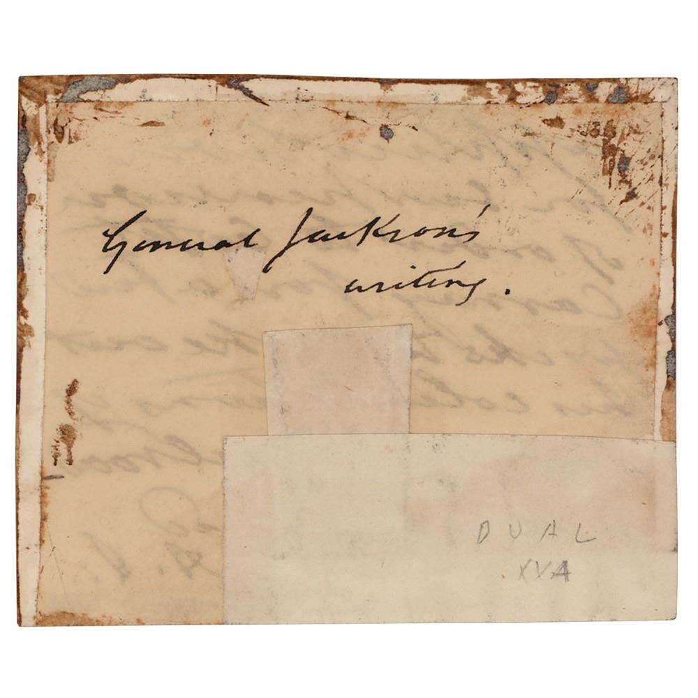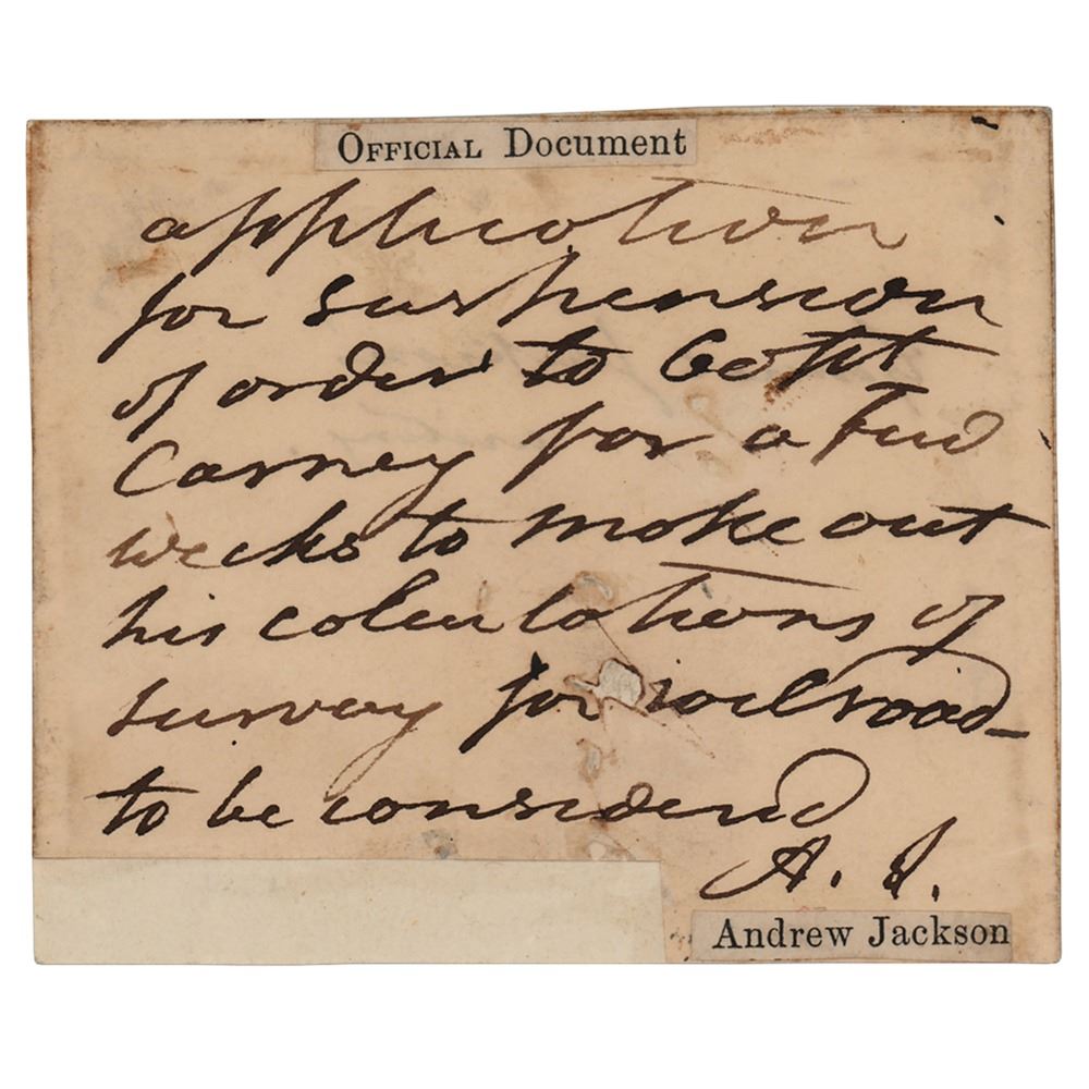 Autograph endorsement signed by Andrew Jackson with his initials, "A. J.," one page, 3.5 x 3, no date. Jackson's handwritten endorsement, in full: "Application for suspension of order to Capt. Carney for a few weeks to make out his calculations of survey for railroad to be considered." In fine condition, with two areas of paper loss, and small captions affixed to upper and lower sections. Accompanied by a letter of authenticity from South Carolina antiquarian Jim Hayes, who dates the endorsement to circa 1820-21, in the territory of Florida.