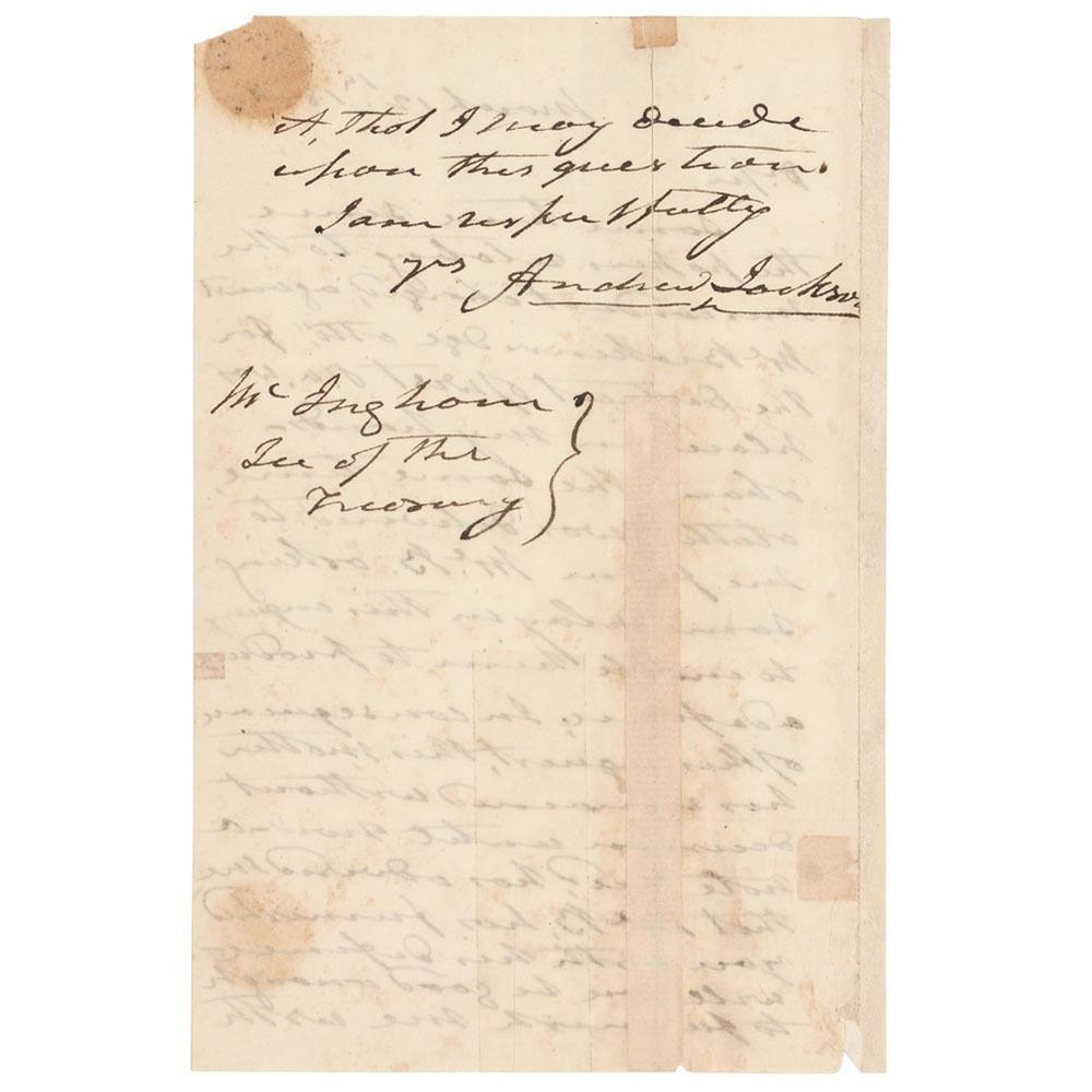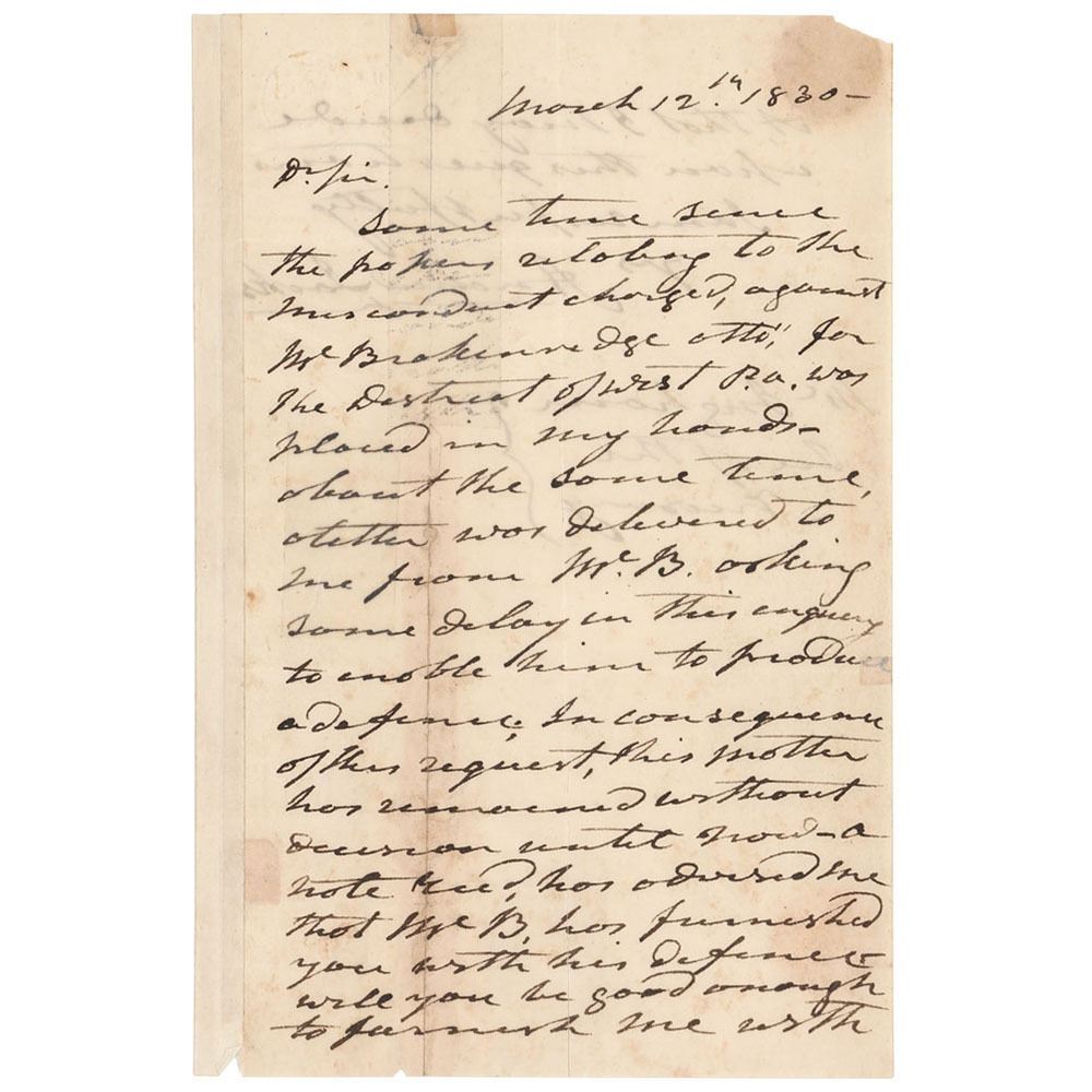 ALS as president, one page, 4.75 x 7.5, March 12, 1830. Handwritten letter to Secretary of the Treasury Samuel D. Ingham, concerning charges brought against Alexander Brackenridge, federal district attorney for western Pennsylvania. In full: "Some time since the papers relating to the misconduct charged, against Mr. Brackenridge, atto. for the District of West P.A. was placed in my hands—about the same time, a letter was delivered to me from Mr. B. asking some delay in this enquiry to enable him to produce a defense. In consequence of this request, this matter has remained without decision until now—a note rec'd has ordered me that Mr. B. has furnished you with his defense—will you be good enough to furnish me with it, that I may decide upon this question." In very good to fine condition, with a stain to the upper right corner, a tear to the lower left edge, and a repair to separation along the vertical fold.