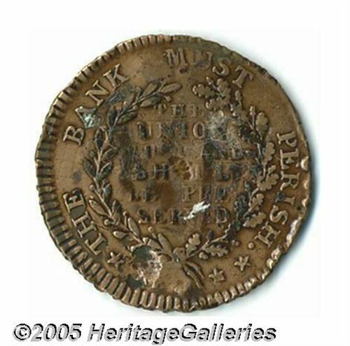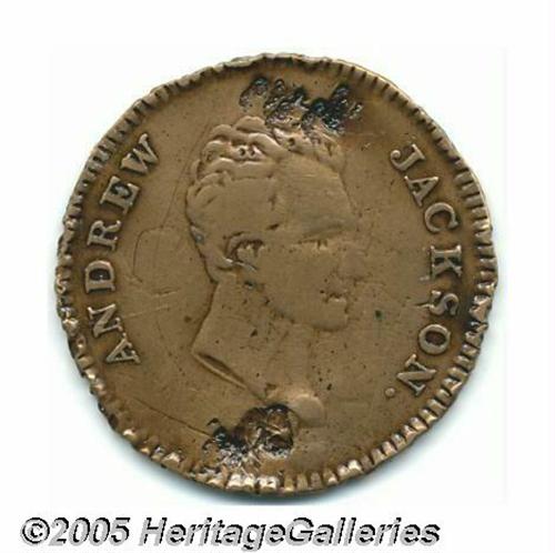<B>Andrew Jackson Campaign and Hard Times Token</B></I> Sullivan-DeWitt AJACK 1832-1, Low #1, 28 mm in copper. This popular token, issued in 1832, but considered a hard times token by specialists, refers to two key elements of Jackson's presidency - the renewal of the charter of the United States Bank and the Nullification Crisis. Grades very good with gouges above and below Jackson's head (which is moderately worn) and adhesive residue on the reverse (likely removable). Very fine specimens typically sell in the $3,000 range. Lot:255