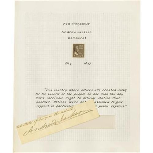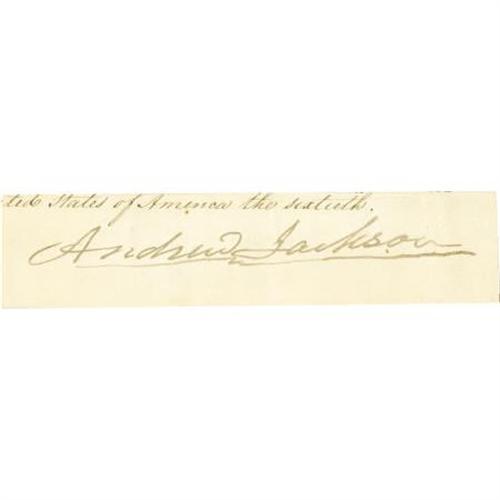 <B>Andrew Jackson Clipped Signature,</B></I> 5.25" x 1". Typically huge Old Hickory autograph clipped from a larger document. Very fine condition. Accompanied by a 7-cent postage stamp carrying Jackson's bust.<BR><BR><b>Shipping:</b> Flat Material, Small (<a target="_blank" href="http://www.heritageauctions.com/common/shipping.php">view shipping information</a>)