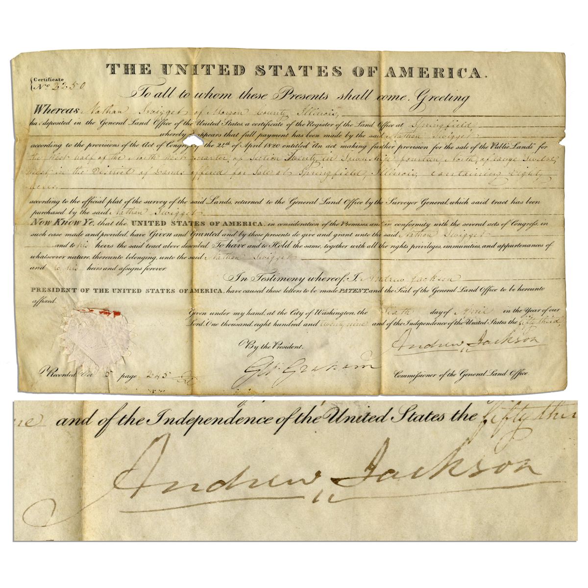 Andrew Jackson signs his full name as President to a land grant dated 6 April 1829, bestowing Nathan Swigget with 80 acres in Springfield, Illinois. Document cites the 24 April 1820 law reducing the federal land purchase minimum from 160 acres to 80 acres as an incentive for Americans to buy. The General Land Office seal is affixed to the lower left. Measures 15.25'' x 9.5''. Folded into twelve sections. Foxing, toning and a small hole at a fold intersection. In very good condition, especially considering its age.