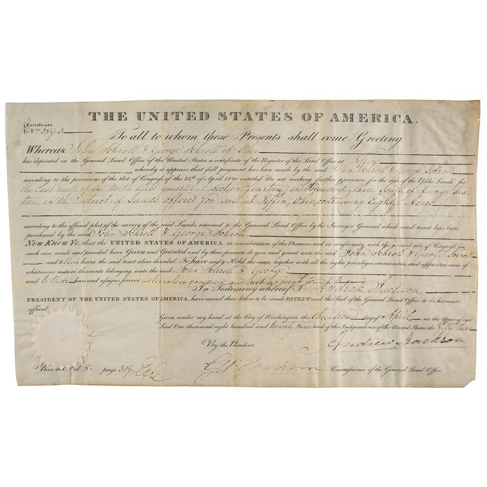 Partly-printed vellum DS as president, one page, 15.25 x 9.5, April 13, 1829. President Jackson grants John and George Schroll of Ohio a parcel from the "Lands offered for sale at Tiffin, Ohio, containing Eighty Acres." Boldly signed at the conclusion by President Jackson and countersigned by Commissioner of the General Land Office George Graham. The white paper seal affixed to the lower left remains intact. In fine condition.