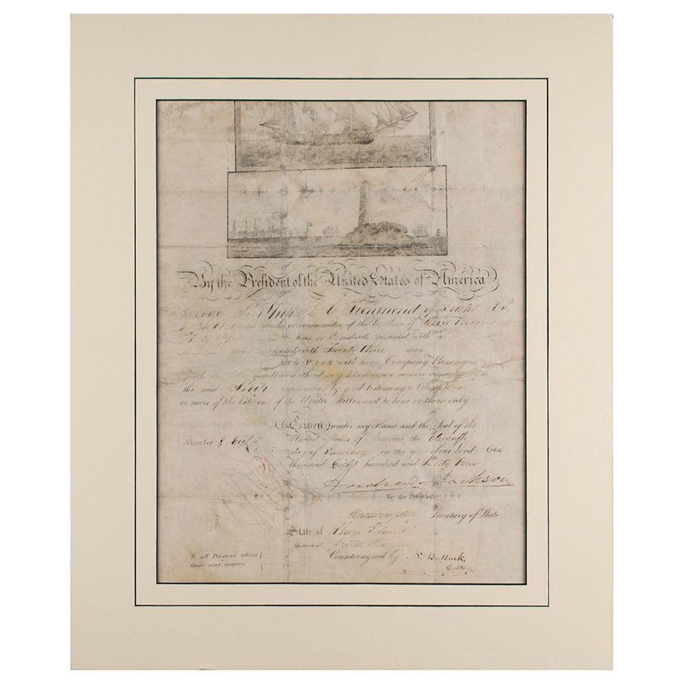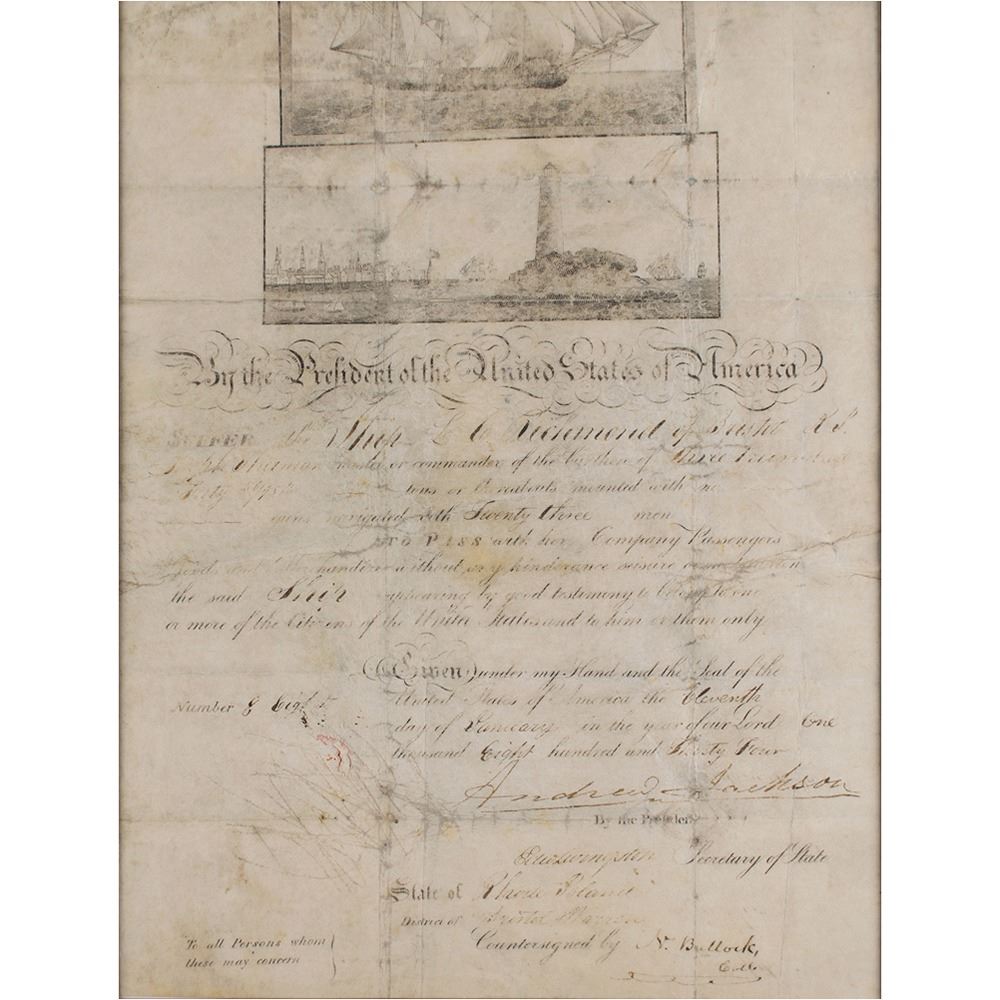 Partly-printed vellum DS as president, one page, 10.5 x 13.75, January 11, 1834. Ship's pass issued for "the Ship L. C. Richmond," signed at the conclusion by President Jackson and countersigned by Secretary of State Edward Livingston. Matted to an overall size of 15.5 x 18.75. In good to very good condition, with soiling, staining, and scratching in the area of the missing seal.