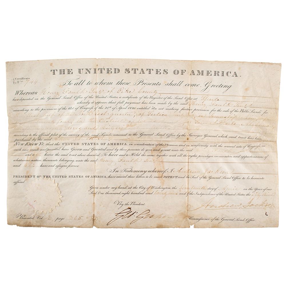 Partly-printed vellum DS as president, one page, 15.5 x 9.5, April 17, 1829. President Jackson grants Henry Faulk Senior of Pike County a parcel from the "Lands offered for sale at Sparta, Alabama, containing Eighty Acres and Thirty eight hundredths of an acre." Signed at the conclusion by Andrew Jackson and countersigned by Commissioner of the General Land Office George Graham. Lower left corner retains the original white seal. In very good condition, with overall rippling, scattered staining, and small areas of vellum loss.