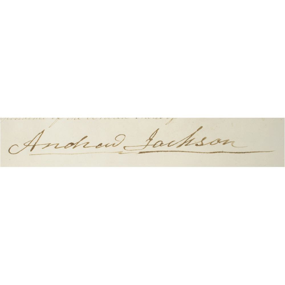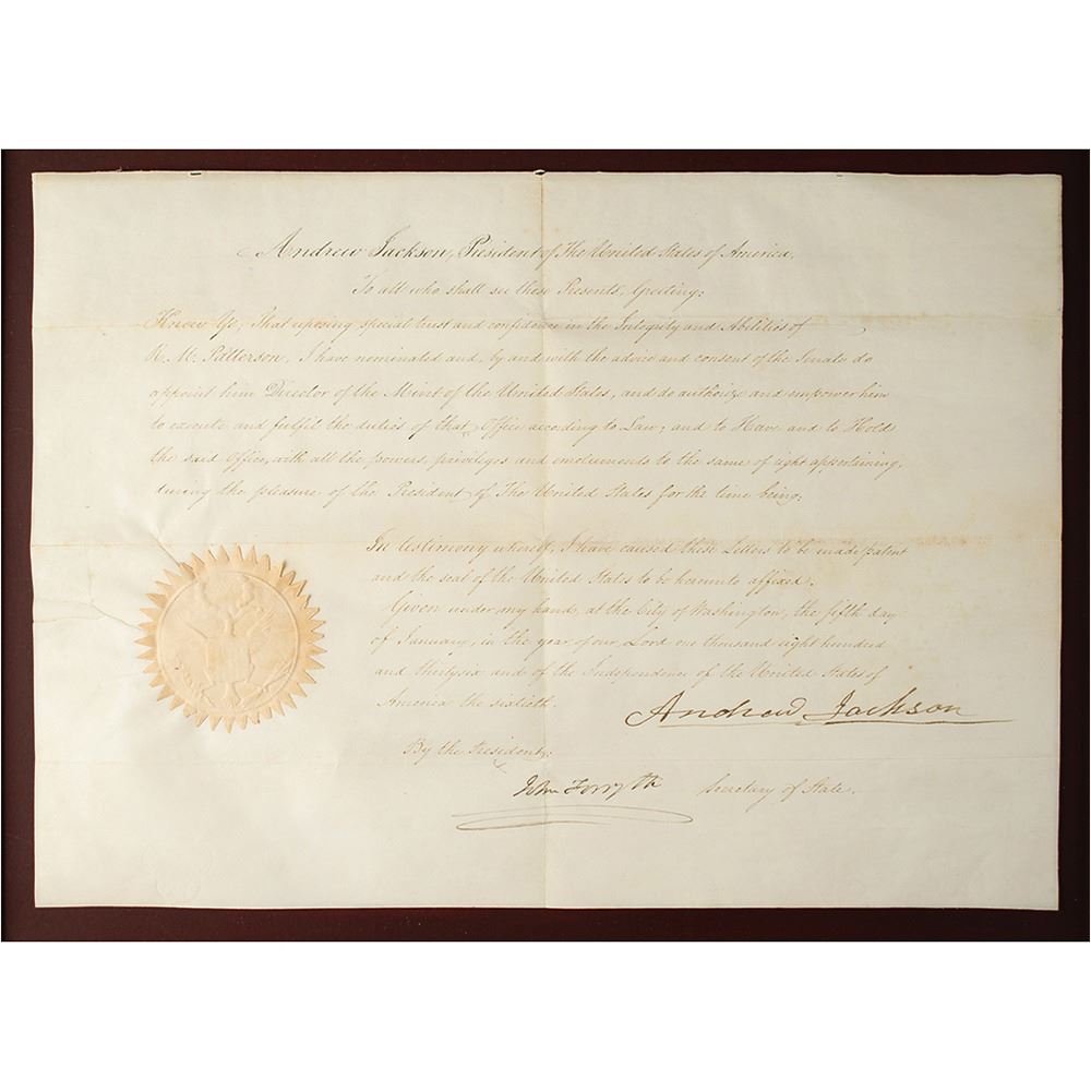 Manuscript DS as president, one page, 16 x 11.5, January 5, 1836. President Jackson appoints R. M. Patterson as "Director of the Mint of the United States." Boldly signed at the conclusion by President Jackson and countersigned by Secretary of State John Forsyth. The white paper seal affixed to the lower left remains fully intact. Beautifully mounted, matted, and framed with a portrait and medal commemorating Patterson to an overall size of 39 x 21; a window in the backing allows the medals reverse to be viewed, reading: "A parting token of regard from the officers and clerks of the mint, 1851." The medal is extremely scarce and desirable in its own right, as one of just 28 struck. In fine condition.