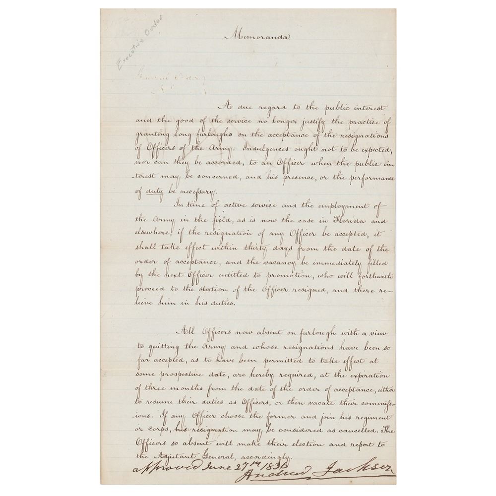 Manuscript DS as president, signed "Approved, June 27th 1836, Andrew Jackson,” one page, 7.75 x 12.5, June 27, 1836. Draft of an official 'General Regulation' relative to the granting of leaves of absence, on the acceptance of the resignations of Officers of the Army, published as part of General Order No. 43 of 1836. In full: "A due regard to the public interest and the good of the service no longer justify the practice of granting long furloughs on the acceptance of the resignations of Officers of the Army. Indulgences ought not to be expected, nor can they be accorded, to an Officer when the public interest may be concerned, and his presence, or the performance of duty be necessary. In time of active service and the employment of the Army in the field, as is now the case in Florida and elsewhere, if the resignation of any Officer be accepted, it shall take effect within thirty days from the date of the order of acceptance, and the vacancy be immediately filled by the next officer entitled to promotion, who will forthwith proceed to the station of the Officer resigned, and there relieve him in his duties. All Officers now absent on furlough with a view to quitting the Army and whose resignations have been so far accepted, as to have been permitted to take effect at some prospective date, are hereby required, at the expiration of three months from the date of the order of acceptance, either to resume their duties as Officers, or then vacate their commissions. If any Officer choose the former and join his regiment or corps, his resignation may be considered as cancelled. The Officers so absent will make their election and report to the Adjutant General, accordingly." In fine condition.