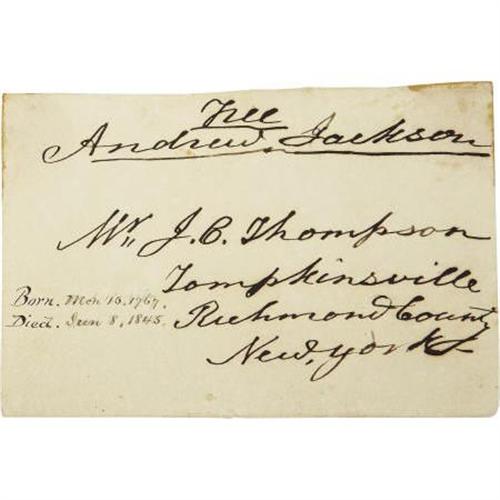 <B>Andrew Jackson Hand Addressed Free Frank.</B></I> An address panel measuring 5" x 3.25" with the following in Jackson's hand: "<I>Free/ Andrew Jackson/ Mr J. B. Thompson/ Tompkinsville/ Richmond County/ New York</B></I>". In another hand at left, a collector has written the dates of Jackson's birth and death. Mounting traces at upper corners and some toning, else fine with an unusually bold signature.<BR><BR><b>Shipping:</b> Flat Material, Small (<a target="_blank" href="http://www.heritageauctions.com/common/shipping.php">view shipping information</a>)