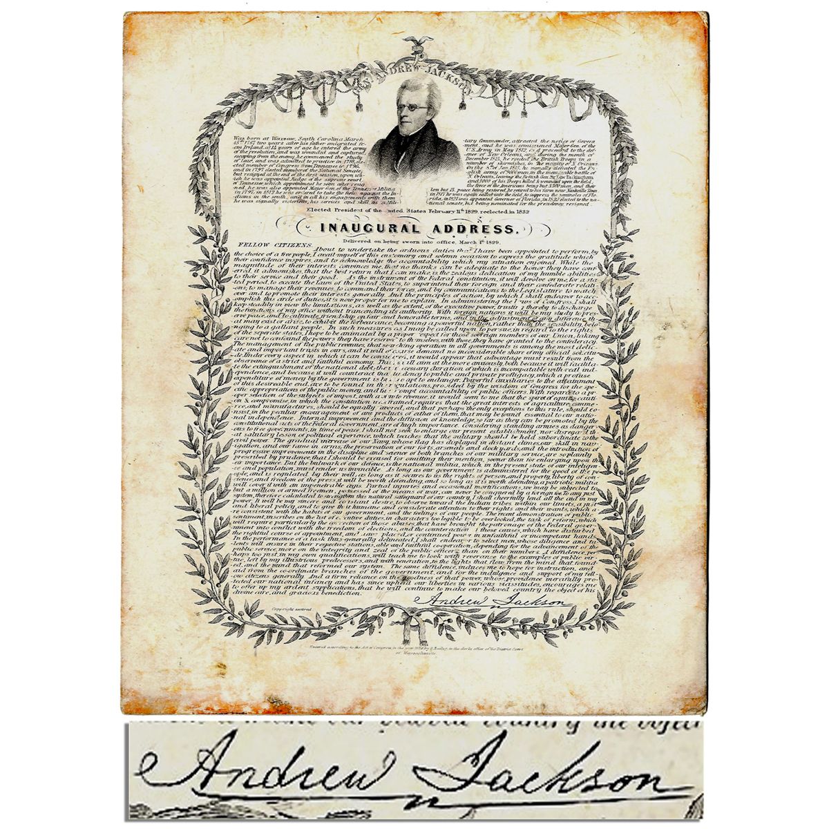United States President Andrew Jackson inaugural address broadside, dated 1836, from the ''clerks office of the District Court of Massachusetts.'' Jackson's address was particularly important as it was the first inaugural address to be given on the East Portico of the United States Capitol, whereas before it had been an indoor, invitation-only affair. Broadside, on thick card stock, measures 5'' x 6.5'', with some very light red staining along edges. Very good.