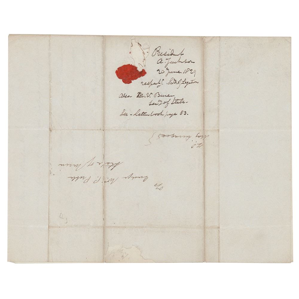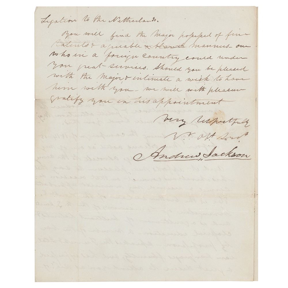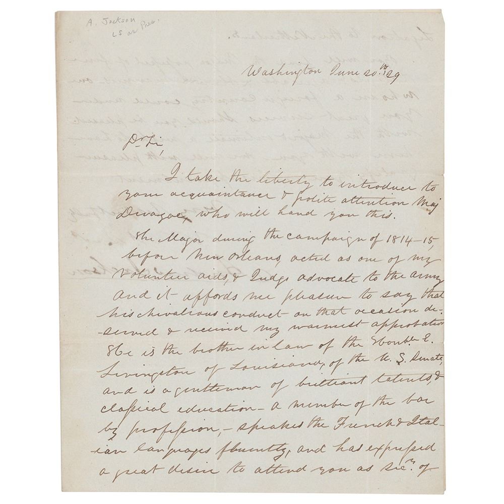 LS as president, one page both sides, 7.75 x 9.75, June 20, 1829. Letter to Maine judge William Pitt Preble, in full: "I take the liberty to introduce to your acquaintance & polite attention Maj. Davezac, who will hand you this. The Major during the campaign of 1814-15, before New Orleans, acted as one of my volunteer aids, & Judge advocate to the Army and it affords me pleasure to say that his chivalrous conduct on that occasion deserved & received my warmest approbation. He is the brother in law of the Hon'ble E. Livingston of Louisiana, of the U.S. Senate, and is a gentleman of brilliant talents, & classical education, a member of the bar by profession, speaks he French & Italian languages fluently, and has expressed a great desire to attend you as Sec'y of Legation to the Netherlands. You will find the Major possessed of fine talents & agreeable manners, one who in a foreign country could under you [perform] great services. Should you be pleased with the Major, I intimate a wish to have him with you, we will with pleasure gratify you in his appointment." In fine condition, with a light stain touching the closing, and seal-related paper loss, and a split fold, to the integral address leaf.