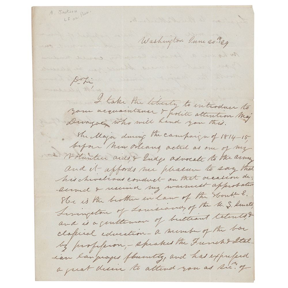 LS as president, one page both sides, 7.75 x 9.75, June 20, 1829. Letter to Maine judge William Pitt Preble, in full: "I take the liberty to introduce to your acquaintance & polite attention Maj. Davezac, who will hand you this. The Major during the campaign of 1814-15, before New Orleans, acted as one of my volunteer aids, & Judge advocate to the Army and it affords me pleasure to say that his chivalrous conduct on that occasion deserved & received my warmest approbation. He is the brother in law of the Hon'ble E. Livingston of Louisiana, of the U.S. Senate, and is a gentleman of brilliant talents, & classical education, a member of the bar by profession, speaks he French & Italian languages fluently, and has expressed a great desire to attend you as Sec'y of Legation to the Netherlands. You will find the Major possessed of fine talents & agreeable manners, one who in a foreign country could under you [perform] great services. Should you be pleased with the Major, I intimate a wish to have him with you, we will with pleasure gratify you in his appointment." In fine condition, with seal-related paper loss, and a split fold, to the integral address leaf.