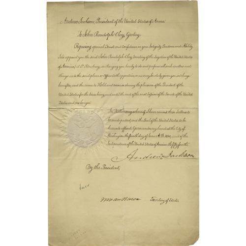 <B>Andrew Jackson & Martin Van Buren Document Signed</B></I> "<I>Andrew Jackson</B></I>" as President and "<I>M Van Buren</B></I>" as Secretary of State. One page, 9" x 14.5", Washington, June 4, 1830. An appointment of John Randolph Clay to the position of "...Secretary of the Legation of the United States of America, at St. Petersburg..." Interestingly, John Randolph Clay has been called our country's first career diplomat. This appointment to Russia was his first post, and he would later serve in Austria and Peru during his 30-year career. This manuscript document is in very good condition; general toning, lower left corner chipped some weakness at folds, minor repairs on verso. From the Henry E. Luhrs Collection. Accompanied by LOA from PSA/DNA.