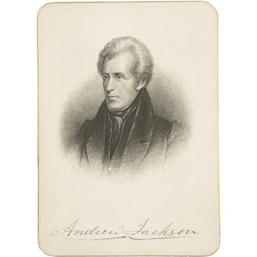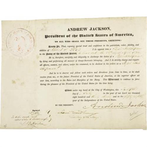 <B>Andrew Jackson Presidential Document Signed</B></I> one page, partially printed, 9.25" x 11.75", countersigned by Secretary of the Navy Levi Woodbury, Washington, D.C., July 12, 1833, appointment naming Robert I. Ross a "<I>Passed Midshipman</B></I>", affixed with embossed Navy Department seal. Soiling with smoothed folds. Very good condition. Lot includes engraved cabinet card portrait of Jackson.<BR><BR><b>Shipping:</b> Flat Material, Small (<a target="_blank" href="http://www.heritageauctions.com/common/shipping.php">view shipping information</a>)