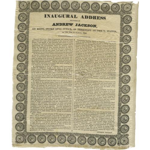 <B> Andrew Jackson Rare and Smaller Version 1829 Inaugural Address Broadside on Silk</B></I> Measuring 10.25" x 12.0". Minor light "aging" Slightly trimmed at top, but bottom intact with original selvage. Couple of minor small horizontal separations and one larger one do not detract significantly when displayed flat, pleasing overall display presence. <BR><BR> During the 1820-1840's, it was a common practice to print presentation copies of important broadsides, especially of a political nature, on silk. A number of Jackson's messages and addresses are found in this form, but visually in larger sizes. 16" x 20" to 20" x 24". The smaller version is quite unusual.