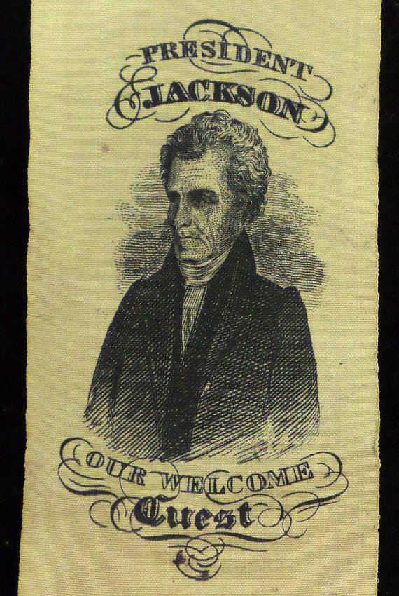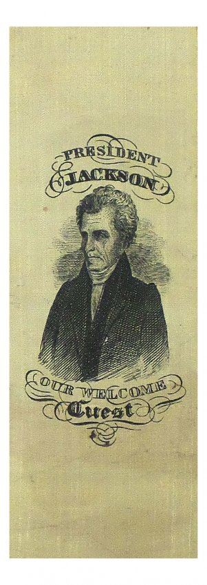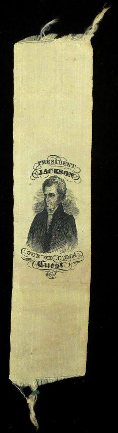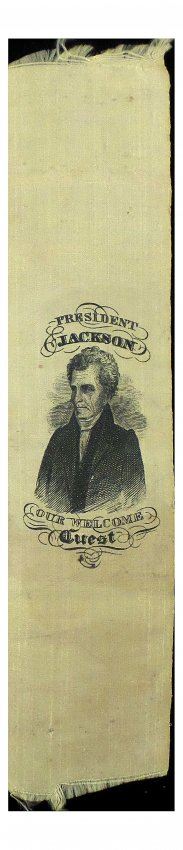 Printed campaign ribbon on yellow silk depicting Jackson in a waist-length 3/4 profile pose. Ornately imprinted above "President Jackson" and below, "Our Welcome Guest" [1-5/8" W x 6-5/8" H not including frayed top and bottom edges]. Light stains with frayed top and bottom edges. Jackson was the first candidate for whom manufactured campaign novelties were produced, and the first to be pictured on a "political" ribbon. This is a rare specimen.