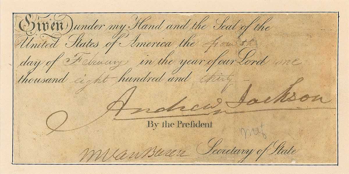 Partial self-contained partly-printed vellum DS, signed by Jackson as president, “Andrew Jackson,” and by Van Buren as Secretary of State, “M. Van Buren,” one page, 6.5 x 3, February 4, 1830. Concluding portion of a larger document, signed by Jackson as president and Van Buren as Secretary of State. Document is inlaid to a slightly larger sheet. In very good condition, with handwritten portions light, but legible, a couple vertical creases, and scattered toning and wrinkling.