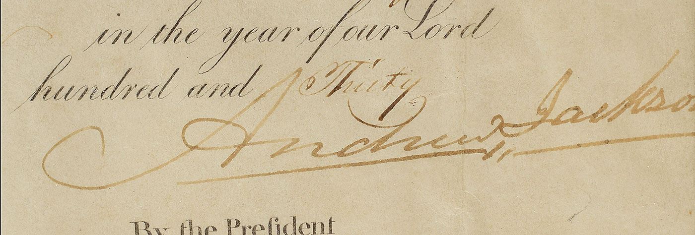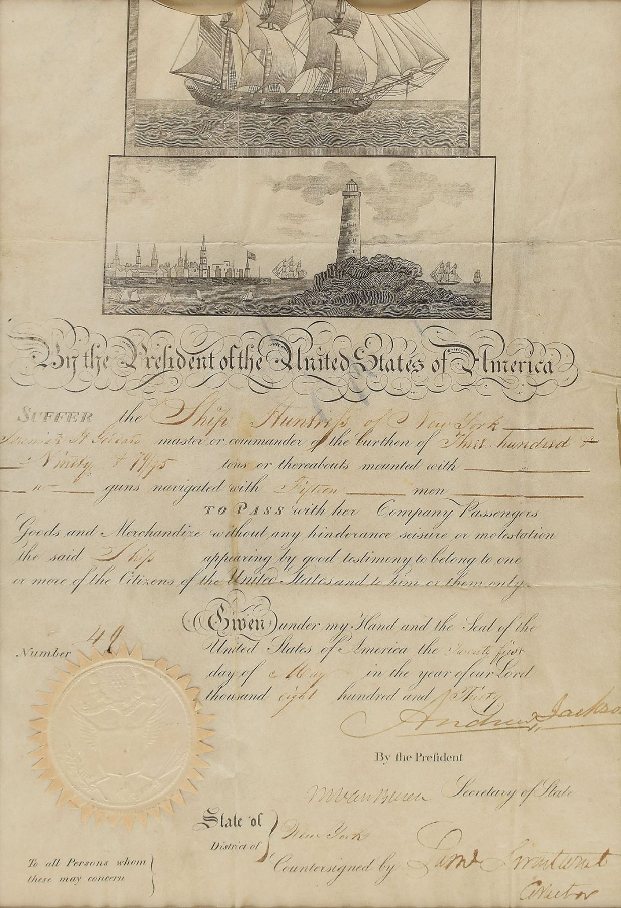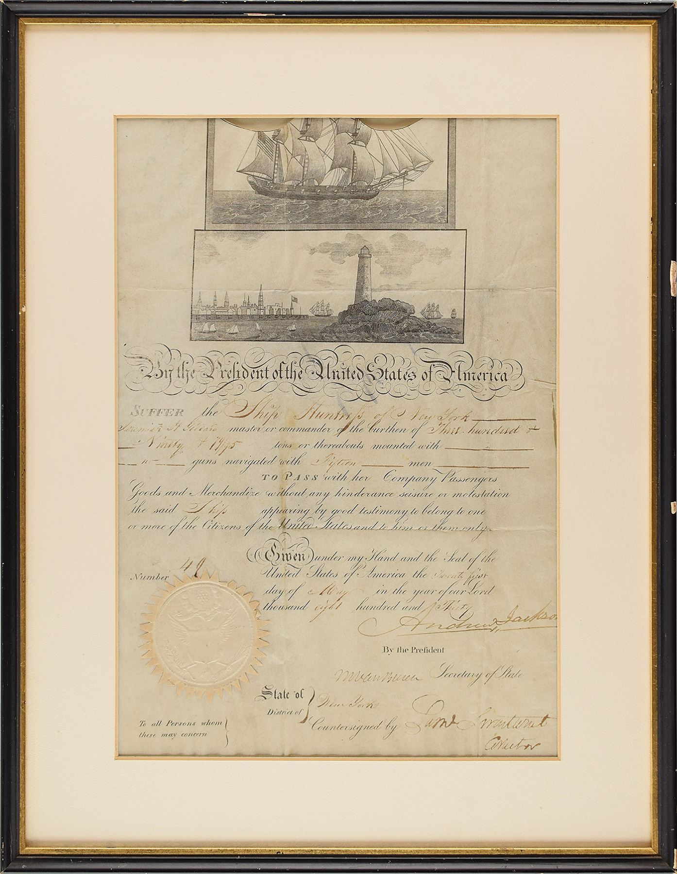 Partly-printed vellum DS, signed “Andrew Jackson" as president and "M. Van Buren" as secretary of state, one page, 10 x 14.5, May 21, 1830. Scalloped-top ship's pass issued to the "Ship Huntress of New York, Jeremiah H. Goddard master or commander of the burthen of Three hundred & Ninety & 19/95 tons or thereabouts mounted with no guns navigated with Fifteen men." Signed prominently at the conclusion by Jackson and countersigned below by Van Buren. Lower left bears the original paper seal. Matted and framed to an overall size of 15.25 x 19.75. In very good to fine condition, with overall rippling and intersecting folds.