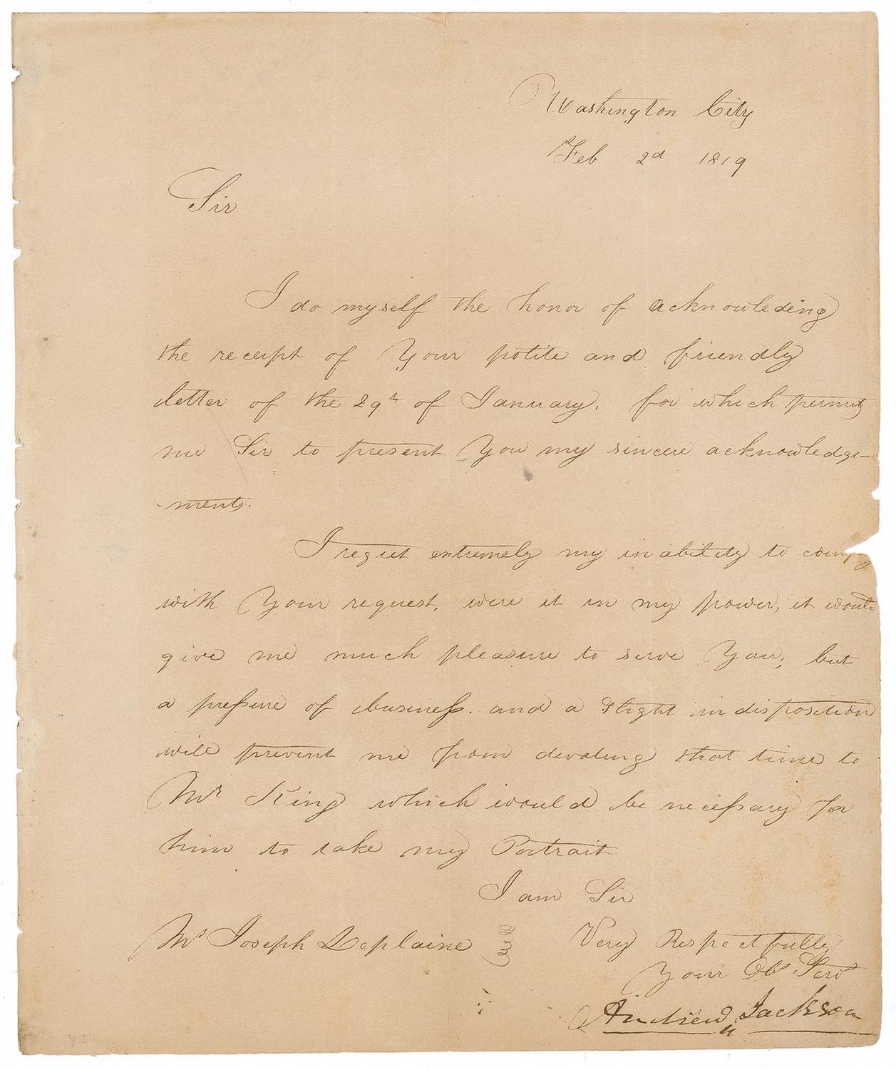LS, one page, 8 x 9.5, February 2, 1819. Jackson writes from Washington to Joseph Delaplaine. In part: “I regret extremely my inability to comply with your request, were it in my power, it would give me much pleasure to serve you; but a pressure of business and a slight indisposition will prevent me from devoting that time to Mr. King which would be necessary for him to take my portrait.” Second integral page bears docketing in another hand as well as an address panel in another hand to Delaplaine in Philadelphia. In very good condition, with several intersecting mailing folds, one through a single letter of signature, paper loss along fragile hinge, a few small edge chips, and light scattered overall toning, soiling, and wrinkling.