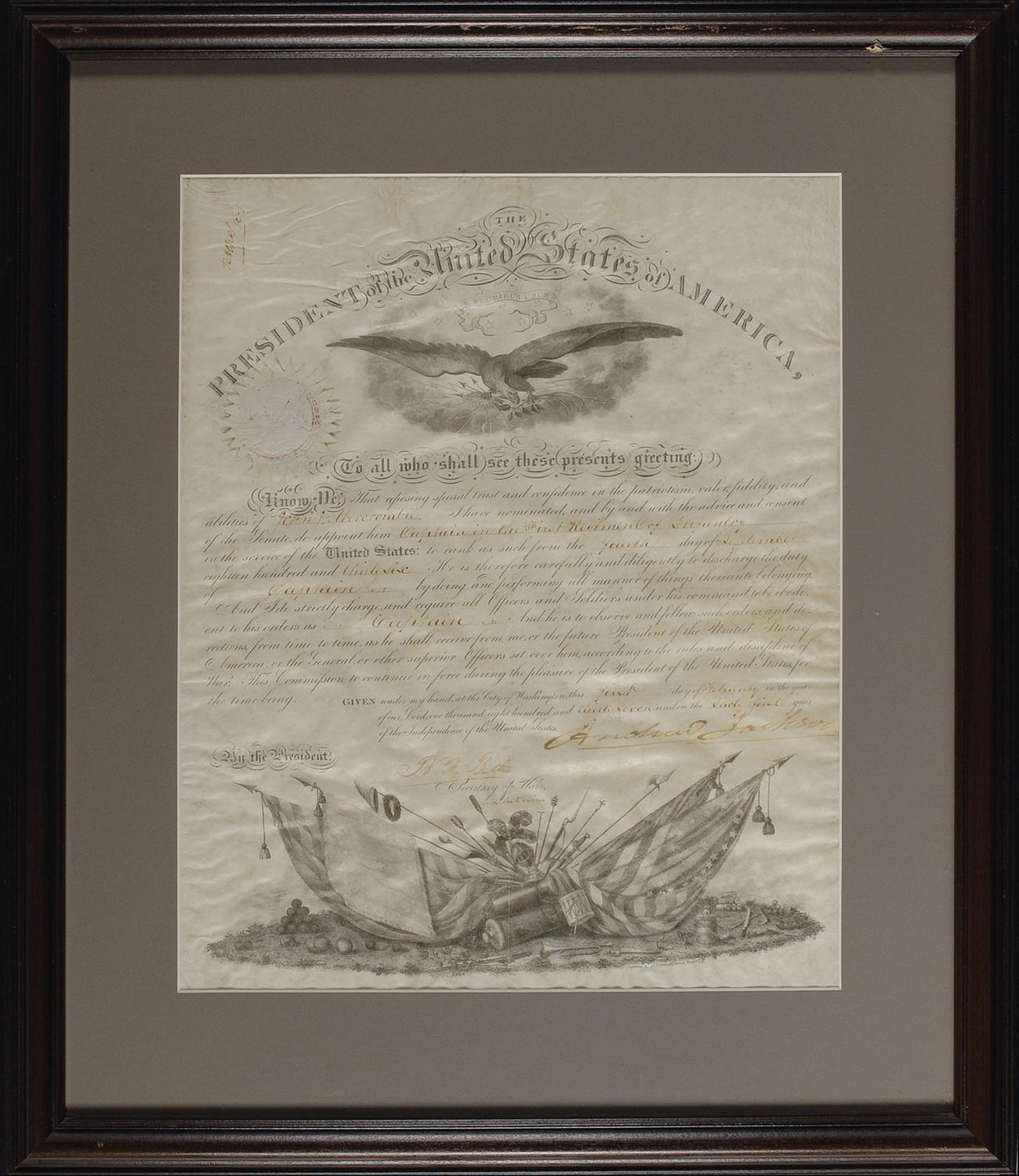 Partly-printed DS as president, one page, 13 x 16, February 1, 1837. President Jackson appoints John Abercrombie a “Captain in the First Regiment of Infantry.” Signed at the conclusion by Jackson and countersigned by Benjamin Franklin Butler, in place of the Secretary of War. Matted and framed to an overall size of 20 x 23.25. In good to very good condition, with overall rippling and wrinkling, scattered toning, and previous storage folds. Jackson’s signature measures an impressive 5.5 inches long.