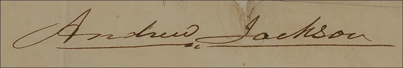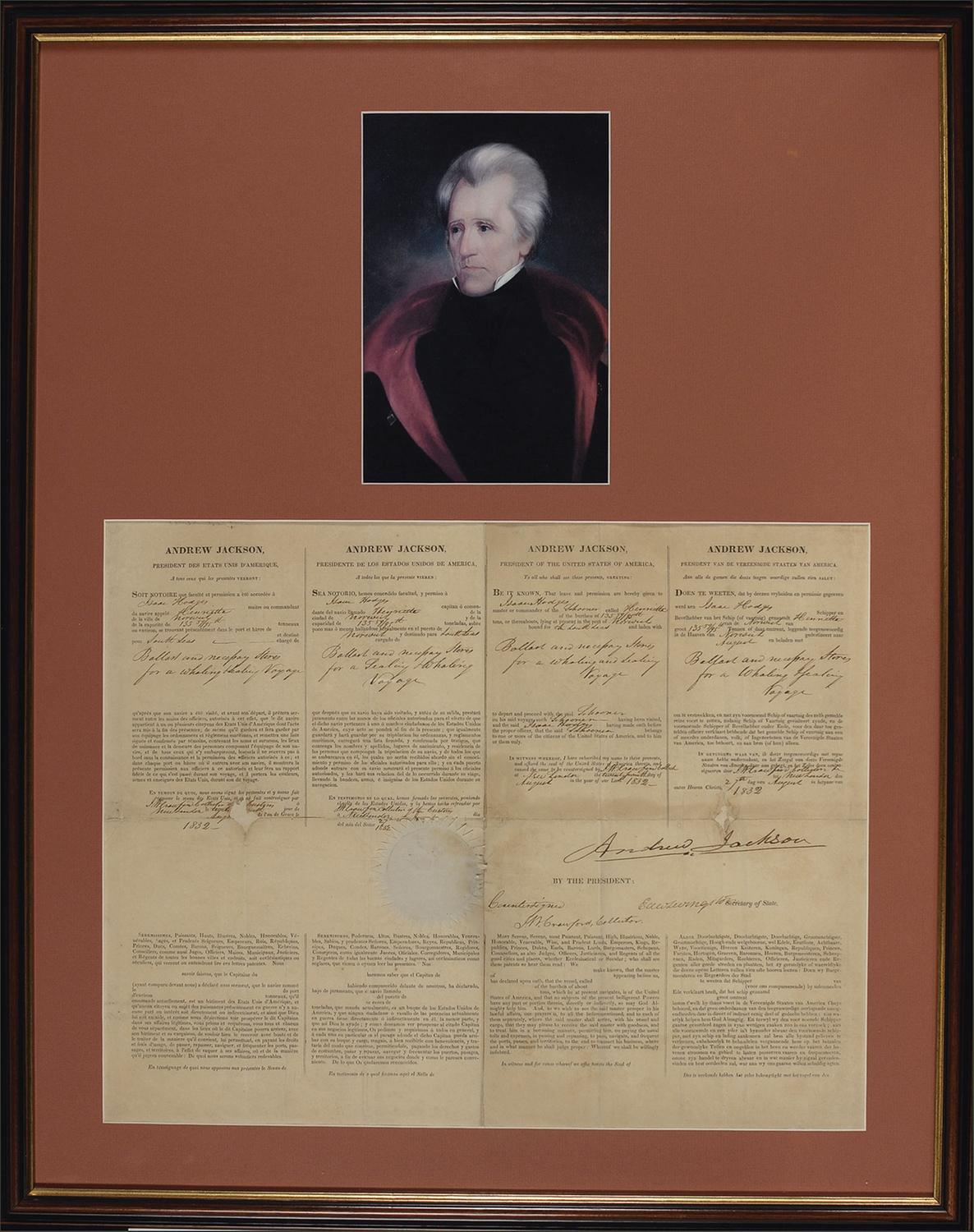 Partly-printed DS as president, signed “Andrew Jackson,” one page, 19.5 x 14, August 27, 1832. A four-language ship’s papers issued to the schooner Henrietta of Norwich and commanded by Isaac Hodges, which carried “Ballast and necessary Stores for a whaling and Sealing Voyage.” Signed in the middle by Jackson with his signature measuring almost 7” in length! The official seal is intact. Matted with a colorized portrait and framed to an overall size of 25.25 x 32. In very good condition, with mild toning and soiling, areas of paper loss along two of the intersecting folds, and a small tear touching the first letter of Jackson’s last name. A ‘whaling and sealing’ ship’s paper is very unusual. Oversized.