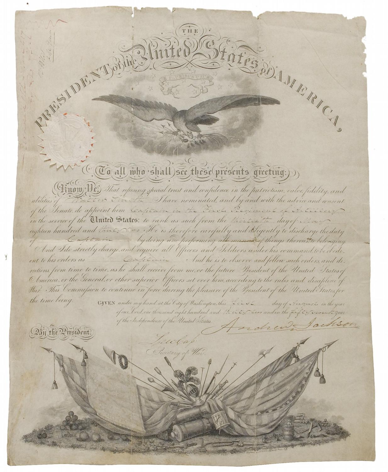 Partly-printed DS as president, one page, 13 x 16.75, August 1, 1832. President Jackson appoints Walter Smith a “Captain in the First Regiment of Artillery.” Signed at the conclusion by Jackson, and countersigned by Secretary of War Lewis Cass. Intersecting folds, one through a single letter of signature, several separations and holes along folds, scattered toning, soiling, and wrinkling, and lightly trimmed vertical edges, otherwise very good condition. The paper seal is toned, but intact.