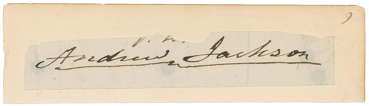 Ink signature, “Andrew Jackson,” on an off-white 5 x 1 slip clipped from a larger letter or document, and affixed to a 5.5 x 1.5 off-white slip. In very good condition, with several vertical creases, one through a single letter of signature, light show-through from adhesive on reverse, a few wrinkles, and paper loss to top edge.