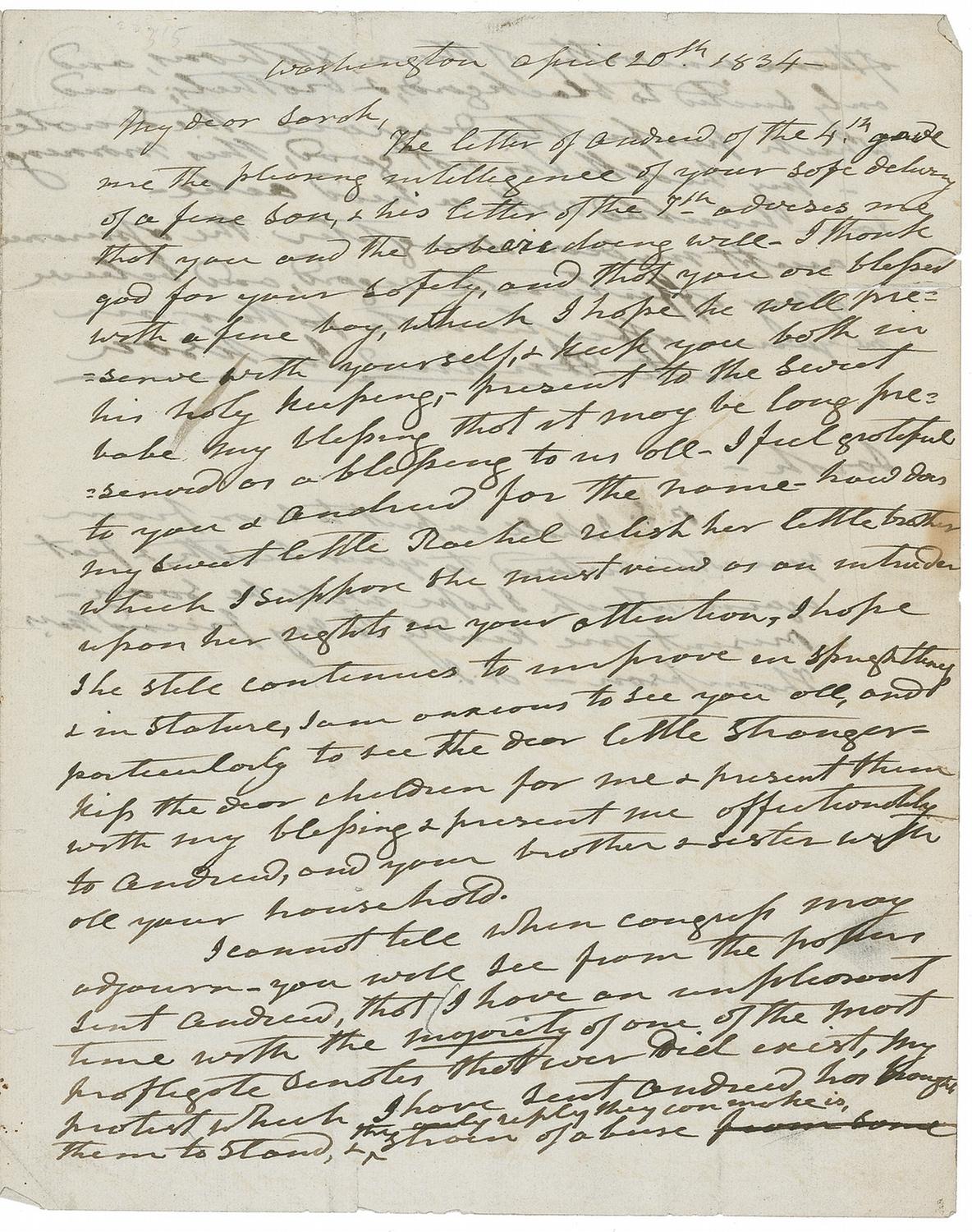 ALS as president, one page both sides, 8 x 9.75, April 20, 1834. Letter to his daughter-in-law Sarah Jackson. In full: “The letter of Andrew of the 4th gave me the pleasing intelligence of your safe delivery of a fine son, & his letter of the 7th advises me that you and the babe are doing well. I thank God for your safety, and that you are blessed with a fine boy, which I hope he will preserve with yourself, & keep you both in his holy keeping, –present to the sweet babe my blessing that it may be long preserved as a blessing to us all. I feel grateful to you & Andrew for the name–how does my sweet little Rachel relish her little brother which I suppose she must view as an intruder upon her rights in your attention. I hope she still continues to improve in sprightliness and in stature, I am anxious to see you all, and particularly to see the dear little stranger–kiss the dear children for me & present them with my blessing & present me affectionately to Andrew, and your brother & sister with all your household.