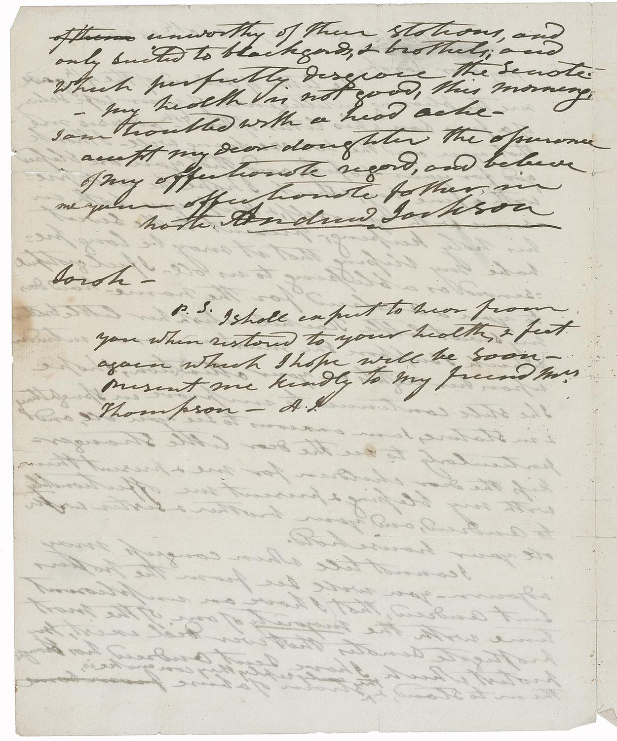 I cannot tell when congress may adjourn–you will see from the papers sent Andrew, that I have an unpleasant time with the majority of one of the most profligate senates that ever did exist, my protest which I have sent Andrew has brought them to stand, & the only reply they can make is, strain of abuse unworthy of their stations, and only suited to blackguards, & brothels; and which perfectly disgrace the senate. My health is not good, this morning I am troubled with a headache. Accept my dear daughter the assurance of my affectionate regard, and believe me your affectionate father, in haste.” Under his signature, Jackson pens a postscript, which reads: “Sarah–P.S. I shall expect to hear from you when restored to your health, & feet again which I hope will be soon– present me kindly to my friend Mrs. Thompson–A.J.” In very good condition, with some splitting along the fragile intersecting folds (a couple folds pass through a single letter of the signature), partial separation along hinge, light show-through from text on opposing sides, light soiling, and a small area of staining to each page. The second integral page bears an address panel in another hand, and black seal remnant.