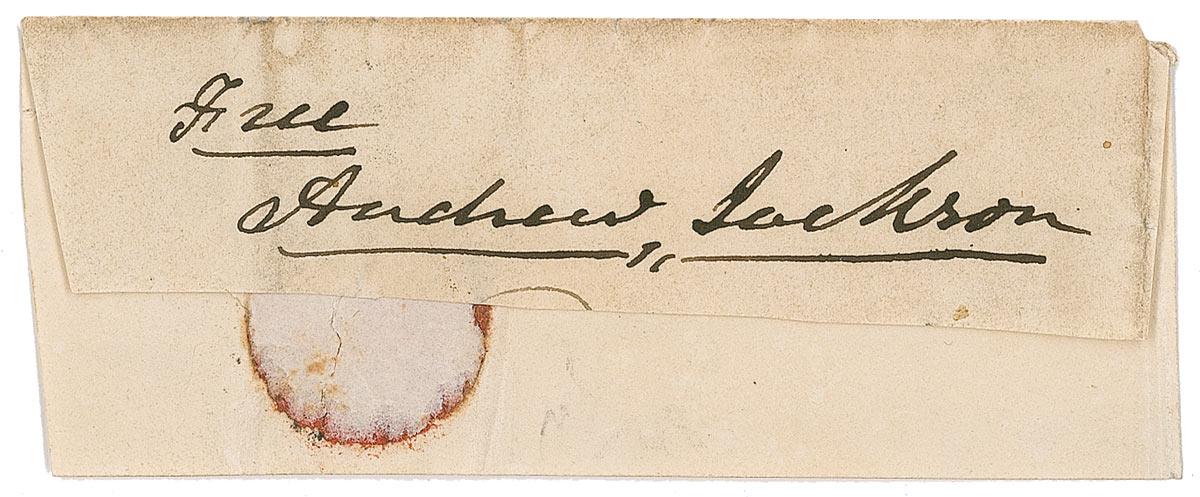 Bold franking signature, “Free, Andrew Jackson,” on an off-white 3.5 x 2.5 clipped slip. Horizontal fold above signature, and scattered toning and creasing, otherwise fine condition.