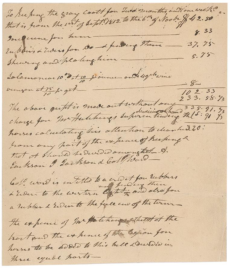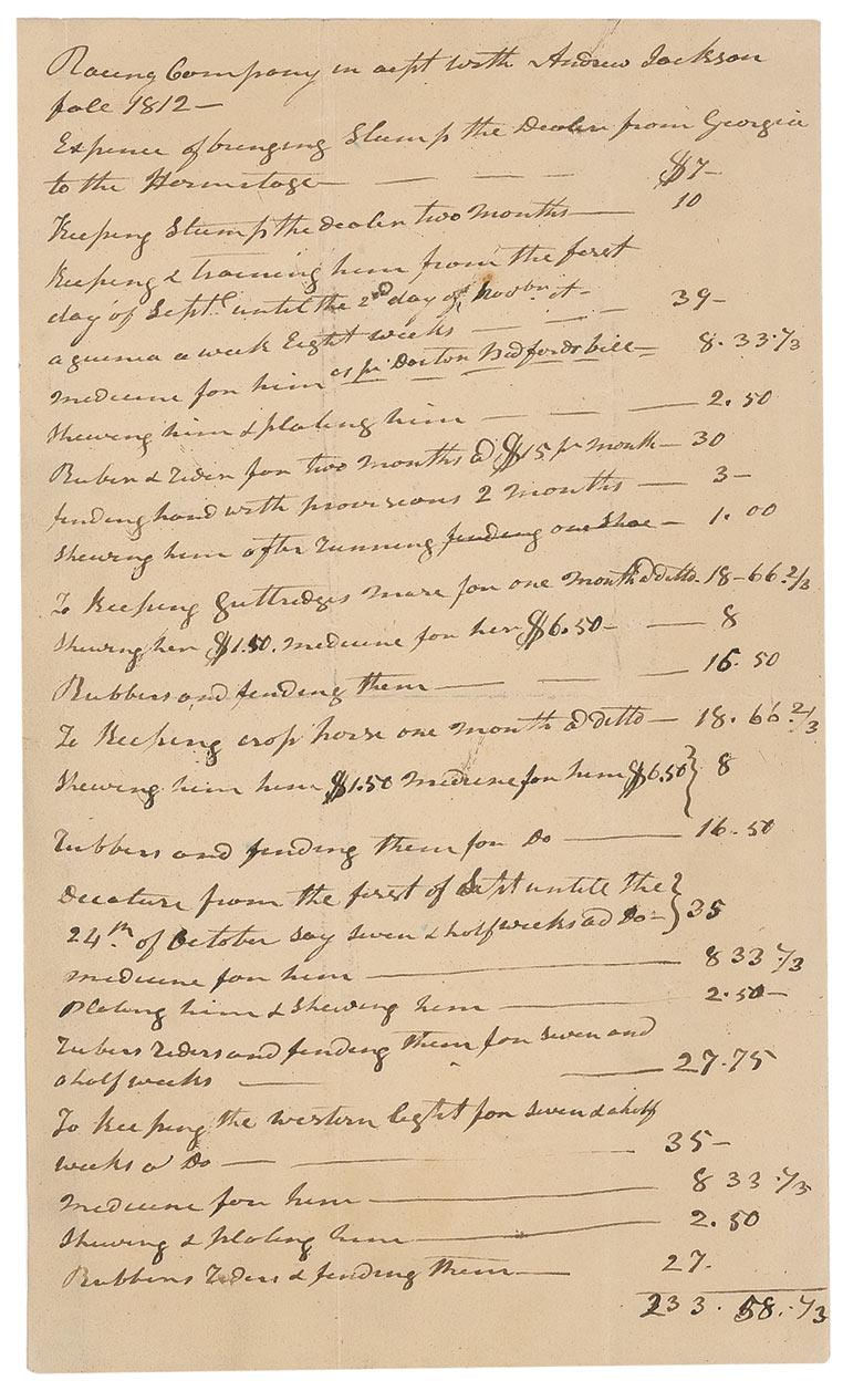 ADS, signed in the text “Andrew Jackson,” and “A. Jackson,” two pages on two adjoining sheets, 7.75 x 13, 1812. Horse expense document is headed at the top, “Racing Company in acct with Andrew Jackson fall 1812.” In part, “Expence of bringing Stump the Dealer from Georgia to the Hermitage — $7. Keeping Stump the dealer two months — 10. Keeping & training him from the first day of Sept until the 2nd day of Nov.br at a guinea a week Eight weeks — 39. Medicine for him as pr Doctor Bedfords bill. — 8.33 1/3. Shewing him & plating him — 2.50…Decature from the first of Sept untill the 24th of October say seven and half weeks…keeping The Western light for seven & a half weeks — 35. Medicine for him — 8 33 1/3. Shewing & plating him — 2.50. Rubbers & riders & finding them 27…” Jackson has totaled this page: “233.58.1/3” At the bottom of the second page, Jackson writes: “The above acctt is made out without any charge for Mr. Hutchings superintending the horses calculating his attention to clear him from any part of the expence of keeping that it should be divided amongst A. Jackson J. Jackson & Col. Ward. Col. Ward is entitled to a credit for rubbers & riders to the Western light and finding them and also for a rubber & rider to the full end of the term. The expence of Mr. Hutchings whilst at the tract and the expence of the liquor for horses to be added to this bill and divided in three equal parts.” Jackson has also docketed the reverse of the second page, “amount of expence of keeping horses in fall 1812 - and cash recd on the 3 days running for settlement.” In very good condition, with bottom of second page trimmed, intersecting folds, one through a signature, uniform toning, and a partial separation along hinge. Document is housed in teal leather half binding clamshell case with blue cloth boards.