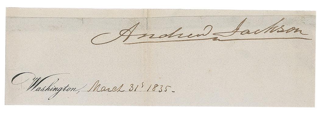 Large ink signature, as president, “Andrew Jackson,” on an off-white 7 x 2.25 slip clipped from a larger document, dated March 31, 1835, in another hand. Vertical fold through a single letter of signature and some scattered light toning and soiling, otherwise fine condition.