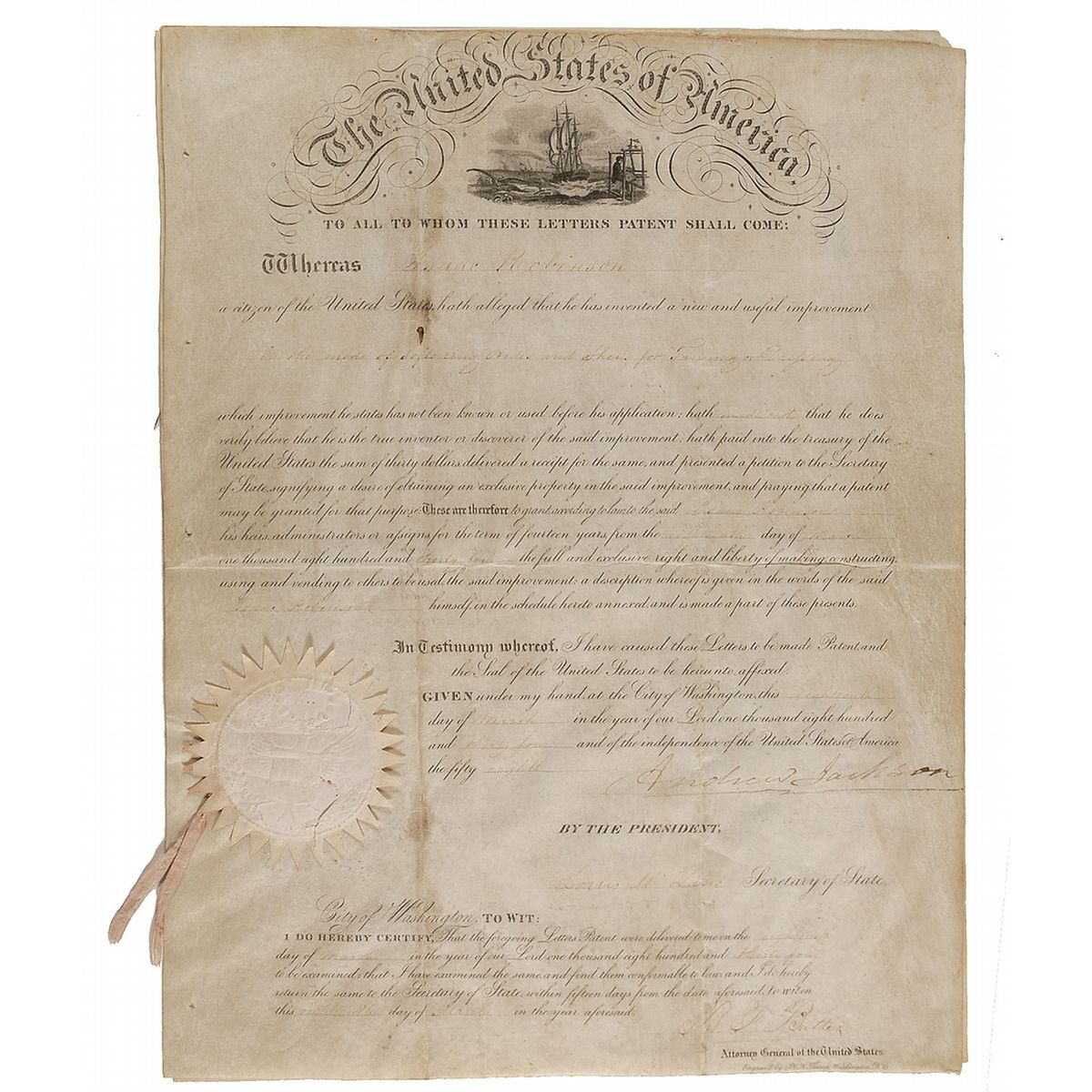 Partly-printed DS as president, two pages, 11.25 x 14.5, March 18, 1834. A patent issued to Isaac Robinson, who “hath alleged that he has invented a new and useful improvement in the mode of Softening Hides and Skins for Tanning & Dressing which improvement he states has not been known or used before his application…These are therefore to grant, according to law, to the said Isaac Robinson his heirs, administrators or assigns, for the term of fourteen years, from the eighteenth day of March one thousand eight hundred and thirty four the full and exclusive right and liberty of making, constructing, using and vending to others to be used, the said improvement; a description whereof is given in the words of the said Isaac Robinson himself, in the schedule hereto annexed.” Second page bears a lengthy detailed description of the improvement, written and signed by Robinson. In good condition, with trimmed top edge to first page, intersecting folds, one through a single letter of signature, small hole along fold of both pages, scattered creasing, toning, and soiling, most of Jackson’s large signature and handwritten text on first page a shade light, some of Robinson’s writing light, but legible, binding holes to left edges. The white wafer seal is worn and toned, but intact.