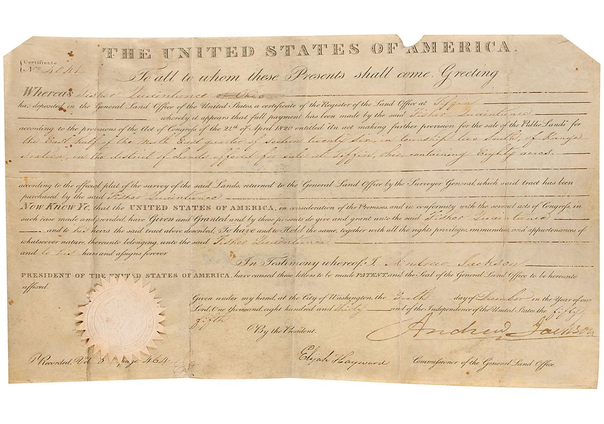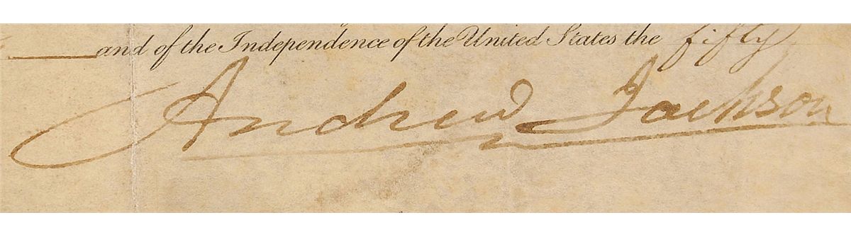 Partially printed DS as president, one page on vellum, 15.5 x 9.25, December 6, 1830. A grant for a parcel of 80 acres of land in Tiffin, Ohio issued to Fisher Quaintance, signed at the conclusion by Jackson and countersigned by Commissioner of the General Land Office Elijah Hayward. In good to very good condition, with two clipped corners and a few edge chips, heavy vertical folds with partial separations (two folds touching first name; separation touching first letter of signature), tiny hole to blank lower margin, and scattered light spotting and soiling. The document bears an embossed paper seal (evidently a replacement, though of the correct period) at lower left. The signature is dark, clear, and otherwise unaffected, and measures an impressive 6.25? long.