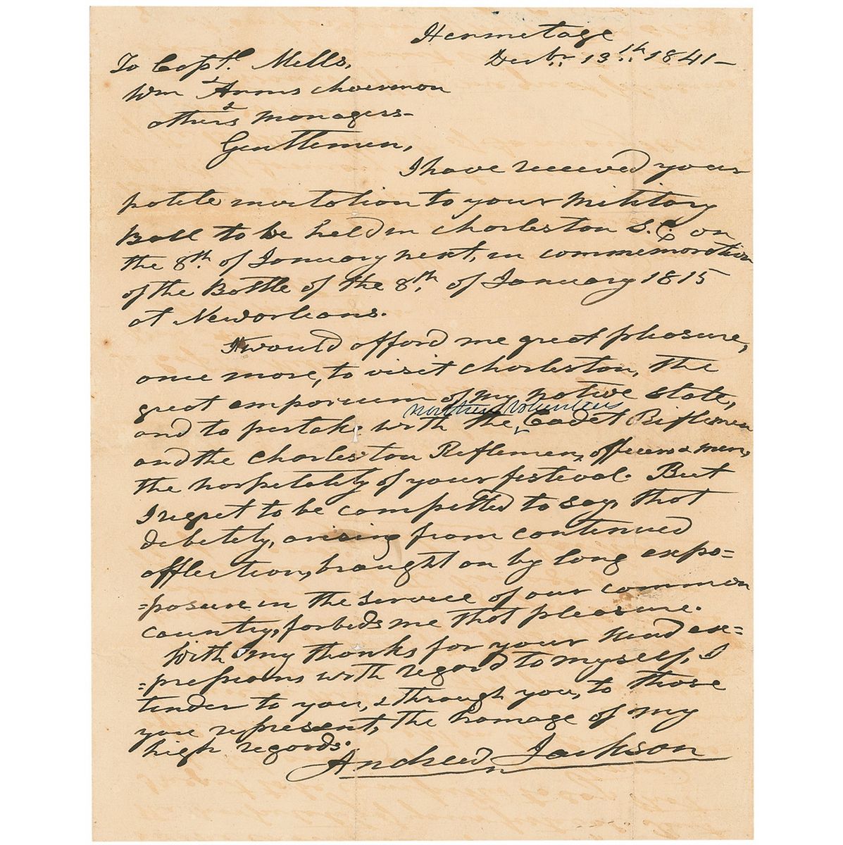 ALS, one page, 7.75 x 9.75, December 13, 1841. From Hermitage, Jackson writes to Captain Mills and several other gentlemen. In full: “I have received your polite invitation to your military ball to be held in Charleston S. C. on the 8th of January next, in commemoration of the Battle of the 8th, of January 1815 at New Orleans. It would afford me great pleasure, once more, to visit Charleston, the great emporium of my native state, and to partake with the [”Northern volunteers” has been added above in another hand] Cadet Riflemen and the Charleston Riflemen, officers & men, the hospitality of your festival. But I regret to be compelled to say that debility arising from continued affliction, brought on by long exposure in the service of our common country, forbids me that pleasure. With my thanks for your kind expressions with regard to myself, I tender to you, through you, to those you represent, the homage of my high regards.” In very good condition, with intersecting folds, two passing through single letters of signature, a couple small pinholes of paper loss along folds, mild toning, two mounting remnants to reverse, and light mirroring of ink.