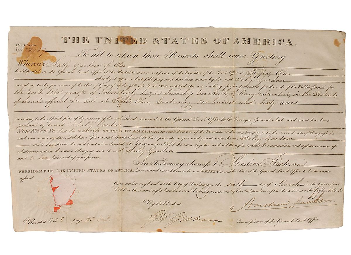 Partly-printed DS as president, one page, 15.25 x 9.25, March 6, 1829. President Jackson grants 160 acres of land in Ohio to Sally Gardner. Signed at the conclusion by Jackson and also signed by Commissioner of the General Land Office George Graham. In very good condition, with intersecting folds, a few scattered stains, and expected creasing and wrinkling. The seal is mostly missing. This is an early example from just two days after his raucous inauguration. Upon Jackson’s inauguration, masses broke into the White House and destroyed the furniture rendering him unable to spend his first night as President in the White House. In addition to this document’s relation to this memorial event, Jackson’s granting land to a woman as he does here is very unusual.