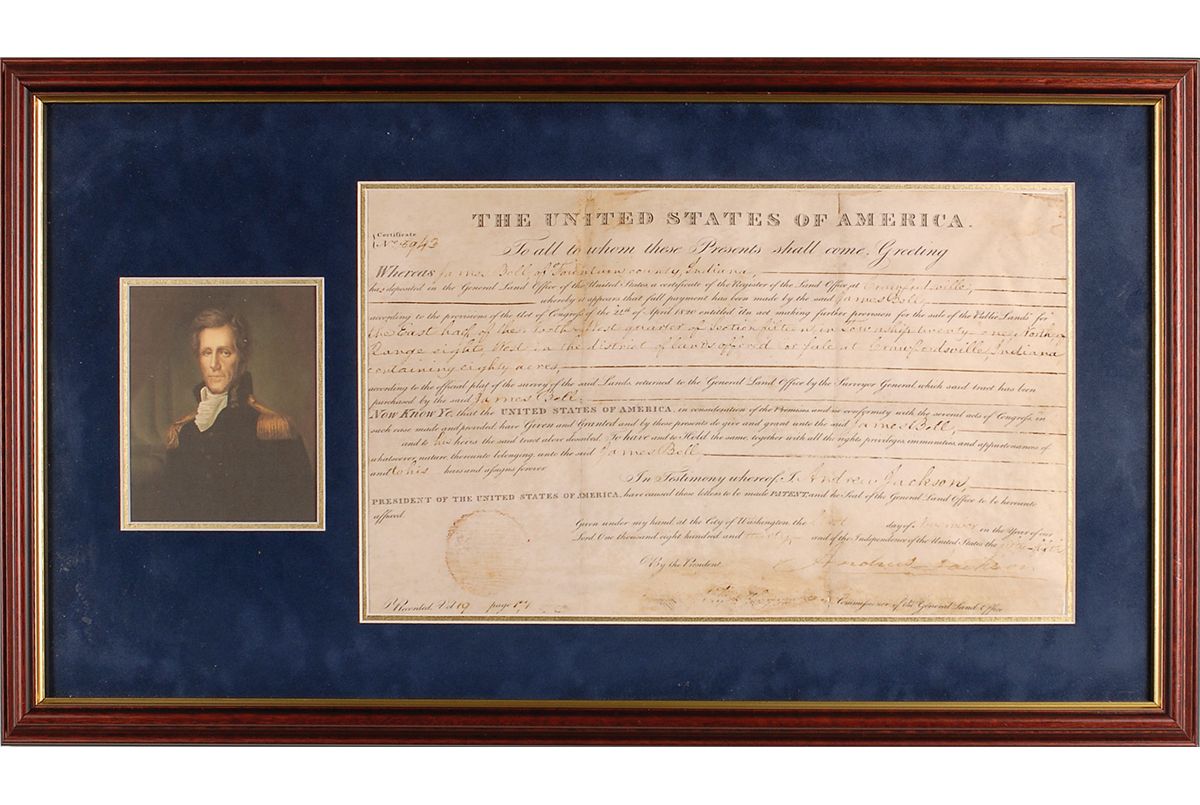 Partly-printed DS as president, one page, 14.5 x 9, November 1, 1830. President Jackson grants James Bell 80 acres of land in Indiana. Signed at the conclusion by Jackson and countersigned by Commissioner of the General Land Office Elijah Hayward. Double suede matted and framed to an overall size of 25.5 x 15. In good condition, with intersecting folds, one through a single letter of signature, scattered toning and dampstaining, some affecting signature, missing seal, and a few small separations along folds. Oversized.