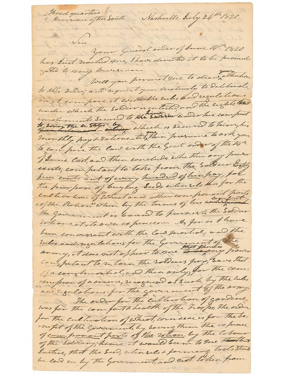ALS, one page both sides, 7.25 x 12.5, July 24, 1820. Letter to Secretary of War John C. Calhoun. In full: “Your General Order of June 14th 1820 has just reached me. I have directed it to be promulgated to my Division. Will you permit me to draw your attention to this order, and request you maturely deliberate on it, compare it with the rules and regulations under which the soldier is enlisted, and the rights and emoluments secured to him under his compact to serve the U. States by which is secured to him, his monthly pay & rations–let me then presume to ask you to compare the law with the Genl order of the 14th of June last, and then conclude whether any power exists, competant [sic] to take from the Soldier [next ten words underlined] Eighty five cents out of every hundred of his pay, for the purpose of buying Seeds utensils [‘Seeds utensils’ underlined] &c &c for the cultivation of 'Wheat and other competent parts of the Ration' when by the terms of his compact the Government is bound to furnish the soldier rations at its own expense.