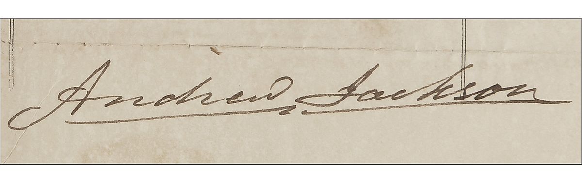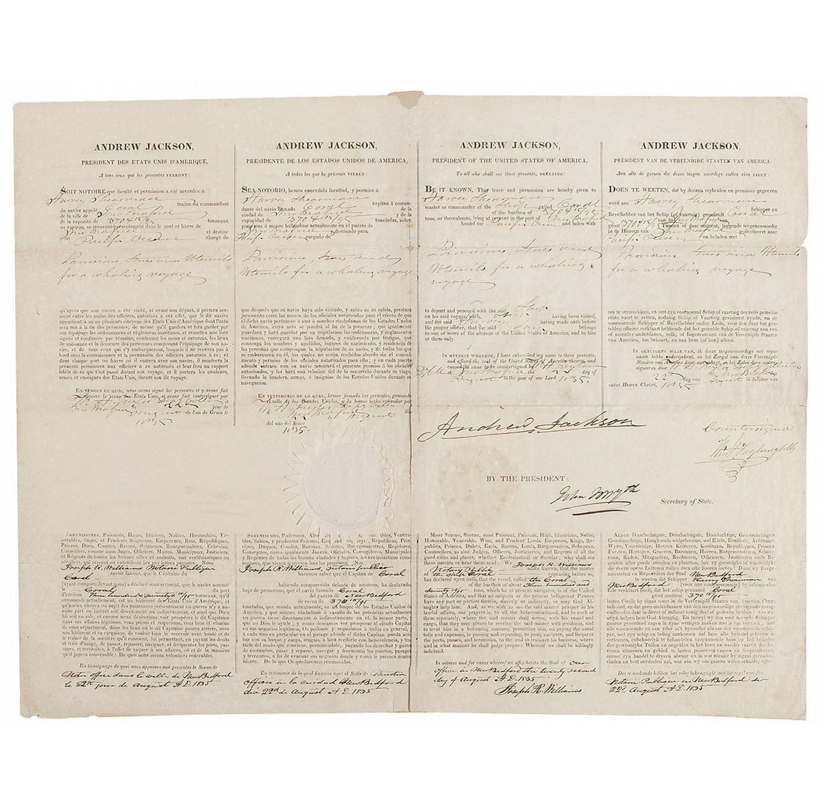 Partly-printed DS as president, one page, 20.5 x 16, August 22, 1835. A four-language ship’s papers issued to “Harvey Shearman master or commander of the Ship called the Coral…lying at present in the port of New Bedford bound for Pacific Ocean, and laden with Provisions, Stores, and Utensils for a whaling voyage.” Signed in the third panel by Jackson and countersigned by Secretary of State John Forsyth. A few small separations along intersecting folds, old reinforcement along reverse of central vertical fold, scattered toning and creasing, with a small crease through first letter of signature, otherwise very good condition. The white wafer seal is slightly toned and creased, but intact. Jackson’s bold signature measures almost six inches in length. Oversized.