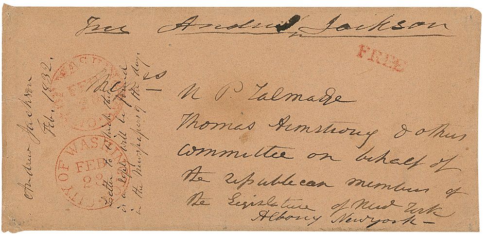 Full free frank, measuring 8.25 x 11 unfolded, with panel measuring 8.25 x 4, addressed in another hand to “Mssrs N. P. Talmage, Thomas Armstrong & others committee on behalf of the Republican members of the Legislature of New York, Albany, New York,” and franked along the top of the panel, “Free, Andrew Jackson.” Left side bears two Washington postmarks, and is docketed in an unknown hand, “Andrew Jackson, Feb 1832, Letter to which this is a reply will be found in the newspapers of the day.” In very good condition, with uniform toning, scattered light soiling, and a few edge tears. Page retains most of its black wax seal.