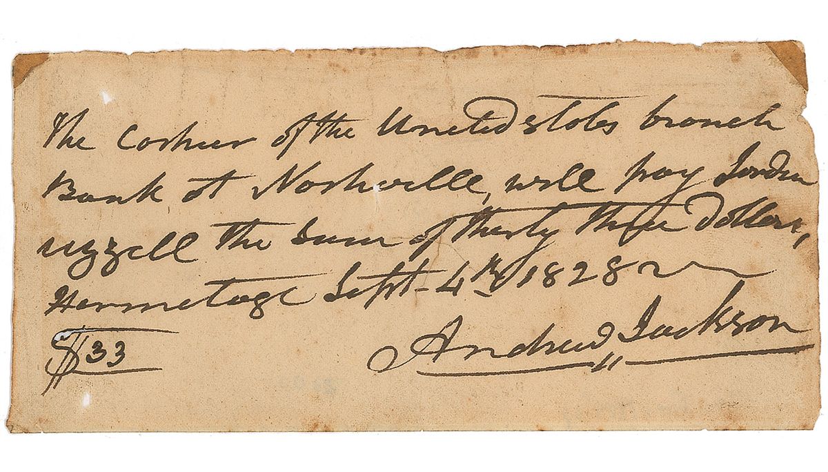 Handwritten check, 6.5 x 3, filled out and signed by Jackson at his home in Tennessee, in full: “The cashier of the United States branch Bank at Nashville, will pay Jordan Uzzell the sum of thirty-three dollars, Hermitage, Sept. 4th, 1828,” adding “$33” in the lower left corner. In very good condition, with cancellation cut to body, a few small areas of ink erosion, scattered toning and soiling, and small mounting remnants to top corners and reverse.