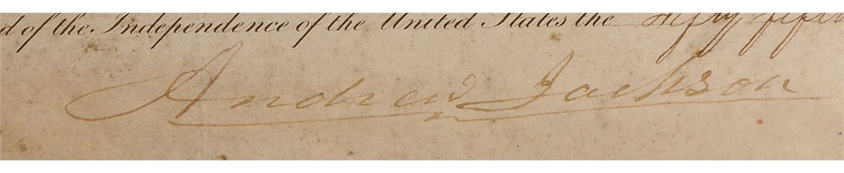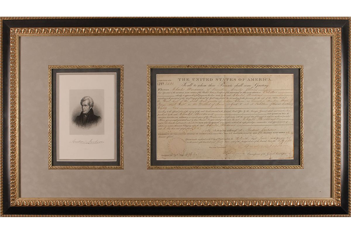 Partly-printed vellum DS as president, one page, 15.5 x 9.5, June 13, 1831. President Jackson grants 80 acres of land in Illinois to Charles Woodward of Vermillion County. Signed at the conclusion by Jackson and countersigned by Commissioner of the General Land Office Elijah Hayward. Double-suede-matted and framed with an engraved portrait of Jackson to an overall size of 40.5 x 23. In very good condition, with intersecting folds and scattered soiling and toning. The white wafer seal is worn but intact. Jackson’s signature measures an impressive 6? long. Oversized.