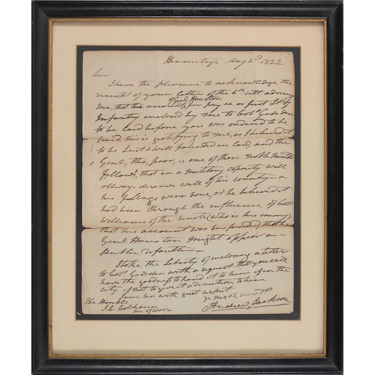 ALS, one page, 8 x 10, Hermitage, May 2, 1822. Letter to Secretary of War John C. Calhoun. In part: “I have the pleasure to acknowledge the receipt of your letter of the 6th ult, advising me, that the account of Genl Houston for pay re as first Lt. of Infantry enclosed by me to Colo Gadsden to be laid before you was ordered to be paid, this is gratifying to me, as I believed it to be just & well founded in law, and the Genl, tho poor, is one of those noble minded fellows, that in a military capacity will always deserve well of his country—& his feelings were sore, as he believed it had been through the influence of Colo Williams of the Senate (who is his enemy) that his account was suspended, that Genl Houston might appear a public defaulter. I take the liberty of enclosing a letter to Genl Gadsden with a request that you will have the goodness to hand it to him if in the city.” Matted and framed to an overall size of 11.75 x 14.25 In very good condition, with intersecting folds, one through a single letter of signature, a few small separations, and some toning along horizontal folds.