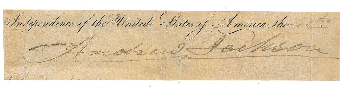 Large ink signature, as president, “Andrew Jackson,” on an off-white 7.25 x 1.5 slip. In very good condition, with three vertical folds, two through single letters of signature, scattered light toning and soiling, and first name of signature a couple shades lighter than last name.
