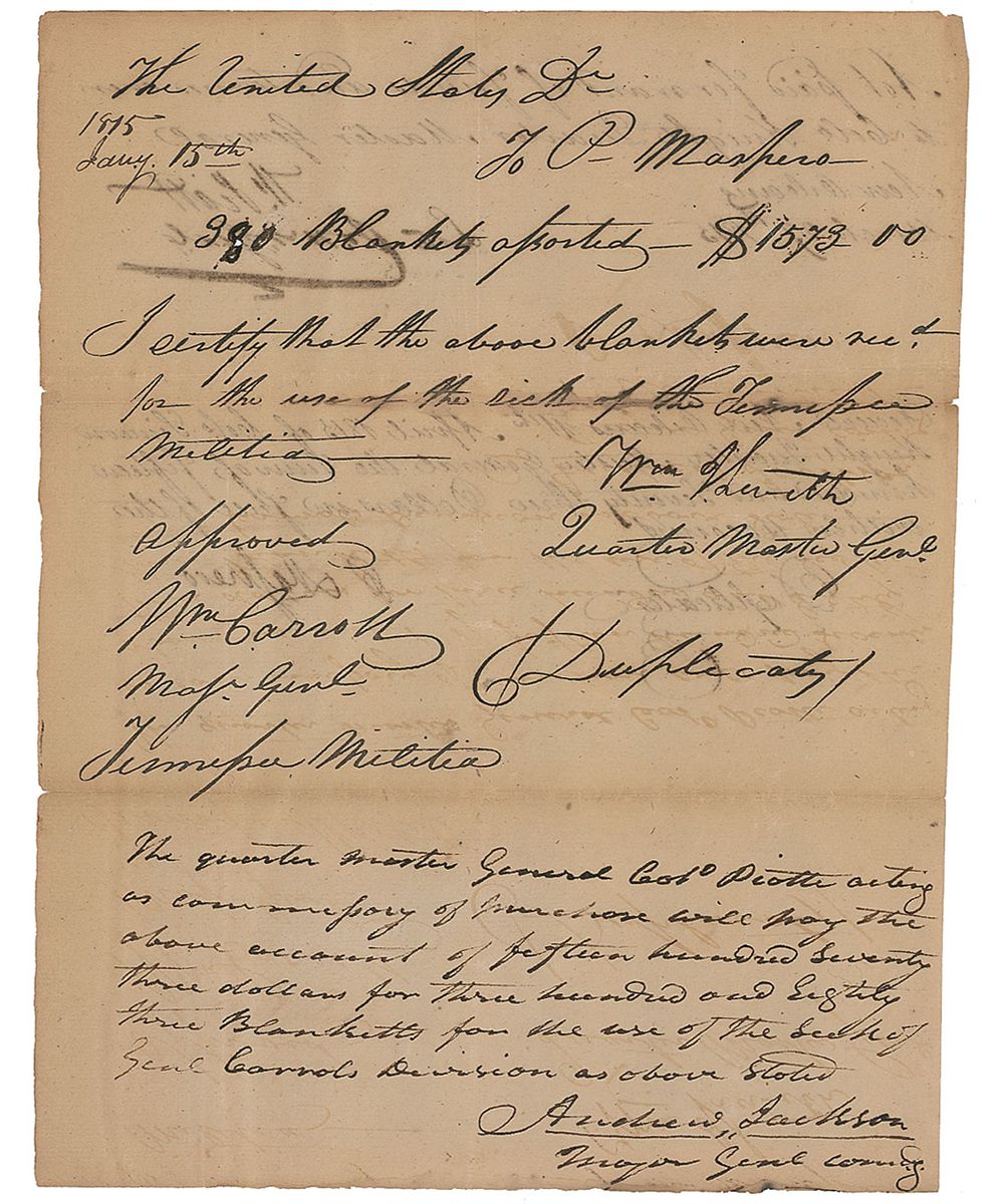 Manuscript DS, signed “Andrew Jackson, Major Genl. Commdg,” one page both sides, 7.5 x 9.75, January 15, 1845. Duplicate copy of a bill for “383 Blankets assorted,” for a total of $1573.00 for the use “of the sick of the Tennessee militia.” In the lower portion, Jackson writes, “The Quarter Master General Colo Piatt, acting as Commissary of Purchase, will pay the above account Fifteen Hundred Seventy-Three Dollars for the Three Hundred and Eighty Three blankets for the use of the sick of General Carrol’s Division as stated above.” In very good condition, with some tape repairs to intersecting folds on reverse, uniform toning, and some show-through from writing on opposite side.